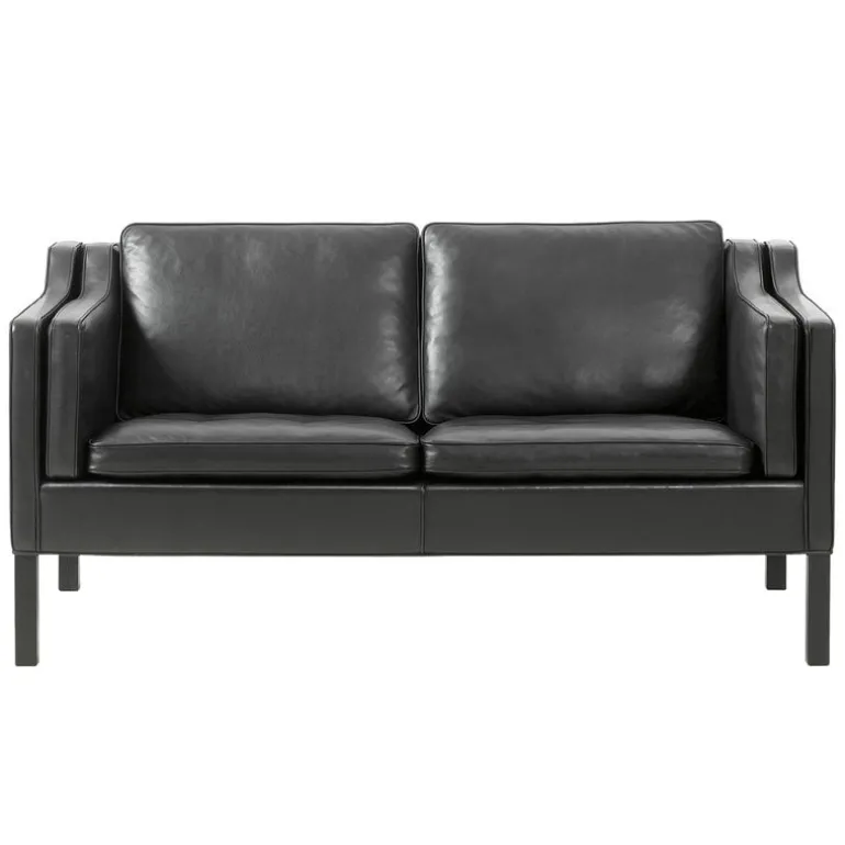 Fredericias soffa 2212 är en tvåsitsig version av lädersoffan som Børge Mogensen designade till sitt eget hem år 1962. Mogensens 2212-soffa har klätts i svart vegetabiliskt garvat anilinläder och har en textur med öppna porer som andas.
