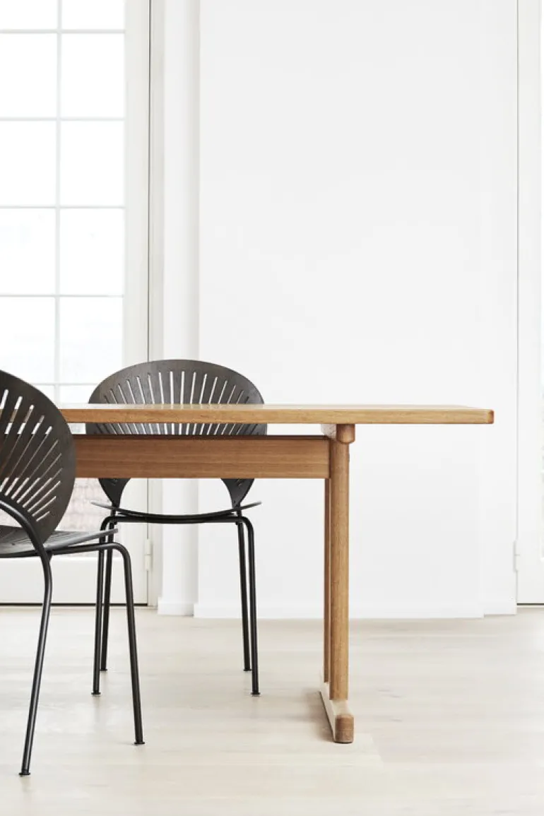 Fredericias Trinidad är en smakfull, dekorativ stol, som formgavs av Nanna Ditzel år 1993. Trinidad drar blickarna till sig med sitt rundade ryggstöd i ek och utstansade gallerverk, som ger stolen en solfjäderliknande look och på ett lekfullt sätt filtrerar ljuset. Sitsen välver sig inåt från sidorna, vilket gör att stolen är bekväm att sitta på även under en längre tid, medan de smala stålbenen fulländar det gracila utseendet.