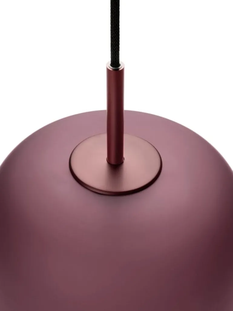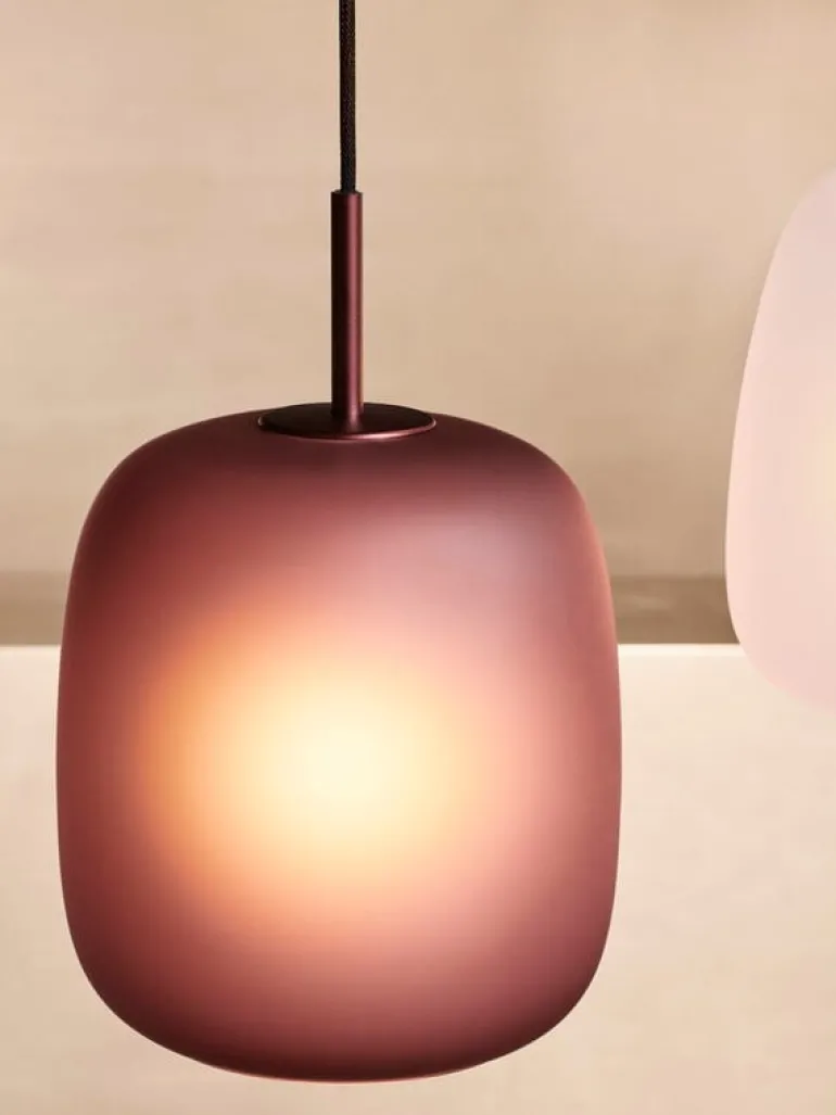 Fritz Hansens pendellampa Maluma består av en kupa i plommonfärgat frostat glas och sladd i matchande nyans. Det frostade glaset skapar ett mjukt ljus som ger atmosfär, och den öppna botten gör att ljuset går rakt neråt. Den dubbla funktionen gör att Maluma passar perfekt både ovanför matbordet och i sovrummet eller vardagsrummet, där man kanske önskar mer stämningsfullt ljus.