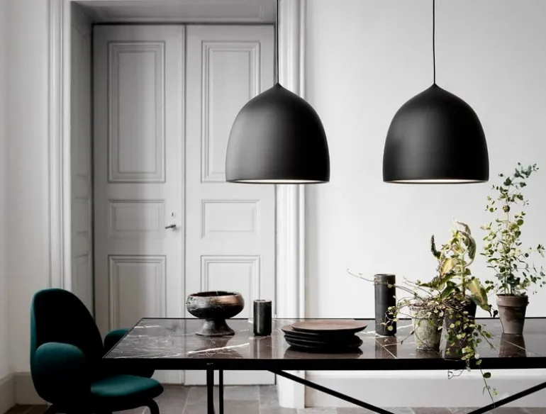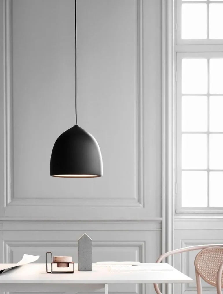 Pendellampan Suspence P2 från Fritz Hansen har en vacker aluminiumskärm med en form baserad på basala, fysiska rörelser: den lilla tippen på lampans topp ser ut som den skapats genom att någon dragit i sladden. Pendellampan är formgiven av GamFratesi och har en infinitydiffuser som koncentrerar ljuset, förhindrar bländning och skapar en optisk illusion av en öppen skärm. Med sin monokroma look och minimalistiska siluett är Suspence P2 väl lämpad för alla utrymmen och miljöer.