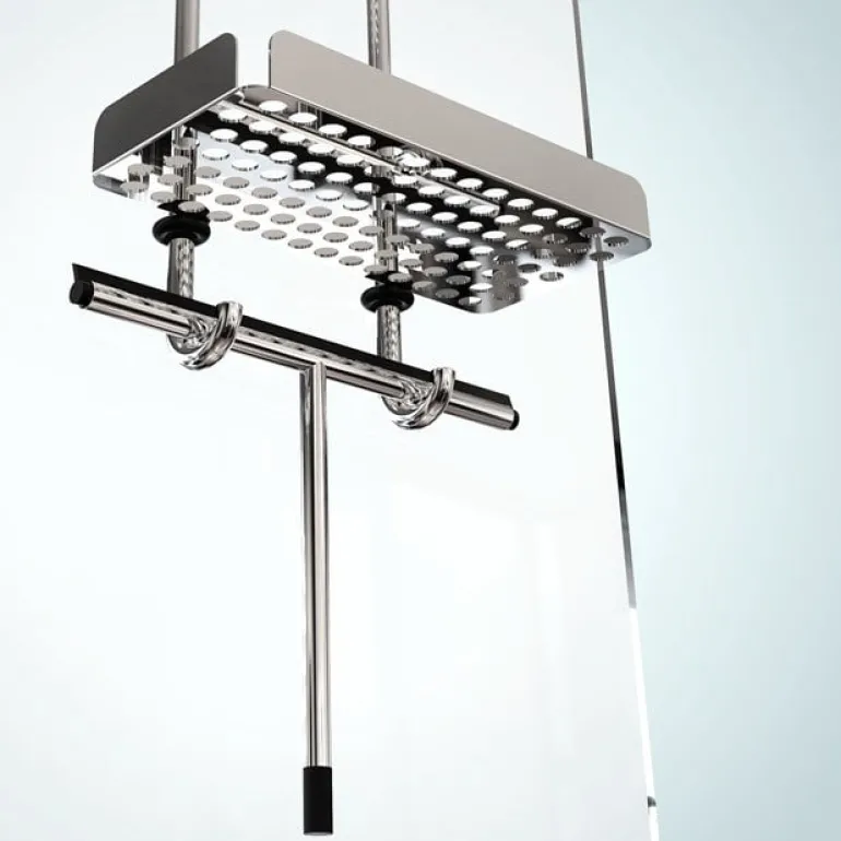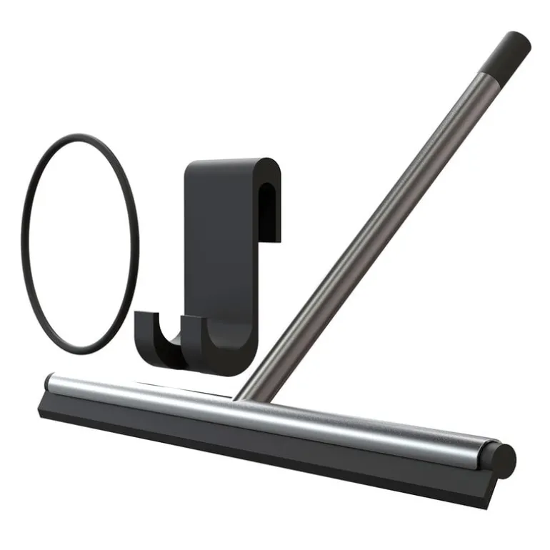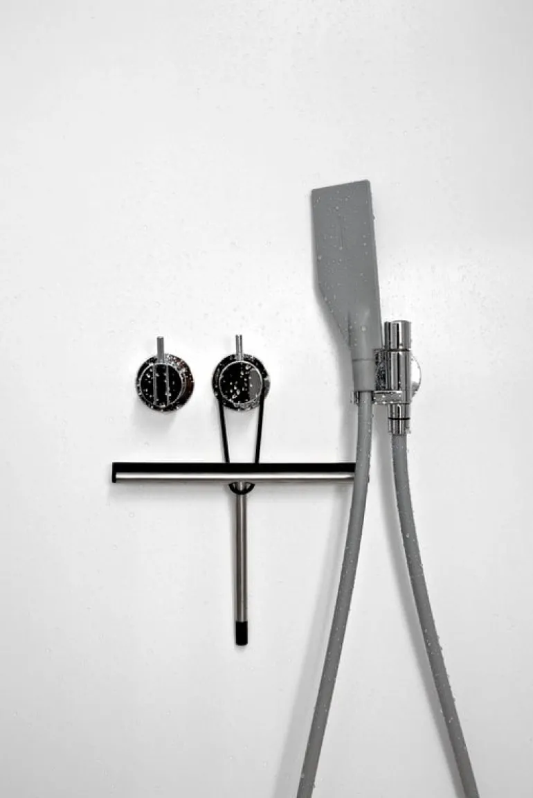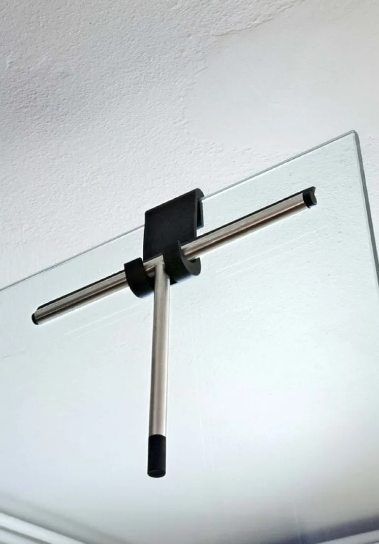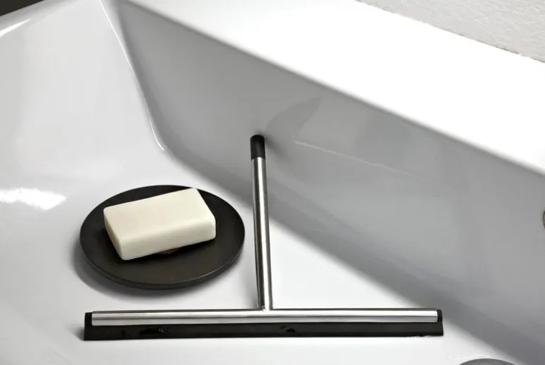 Nova2-duschskrapan från Frost tillför en touch av modern dansk funktionalism i badrummet. Skrapan medföljs av en gummikrok och ett band så att den kan hängas.