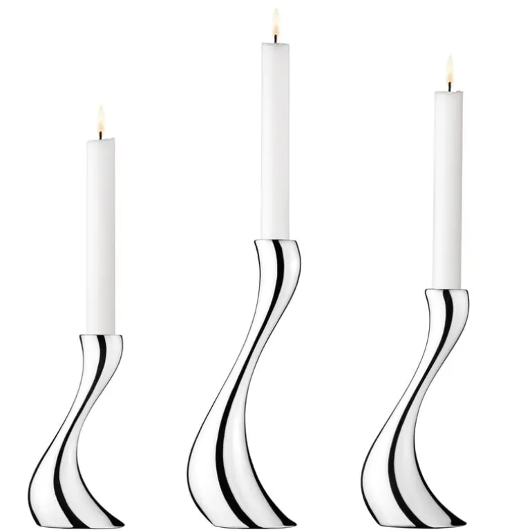 Georg Jensens Cobra-ljusstake för golvet fångar allas blickar med glans av spegelpolerat stål. Ljusstakarnas organiska linjer påminner om smältande vax – nästan som om en klassisk ljusstake hade börjat smälta.