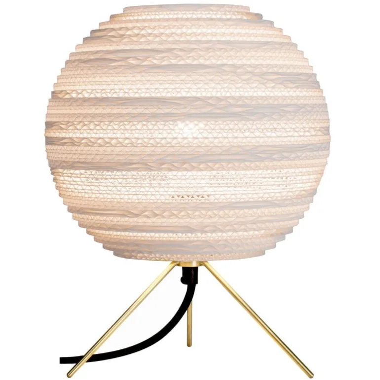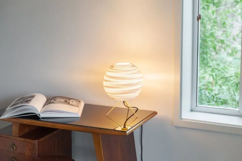 Bordslampan Moon från Graypants ger ett mjukt, bländfritt sken som skapar en varm och välkomnande atmosfär för alla utrymmen och tillfällen. Korrugeringarna på lampans runda skärm, som är gjord av kartong, lyser upp på ett fascinerande sätt och ger lampan en unik struktur och karaktär även när ljuset inte är tänt.
