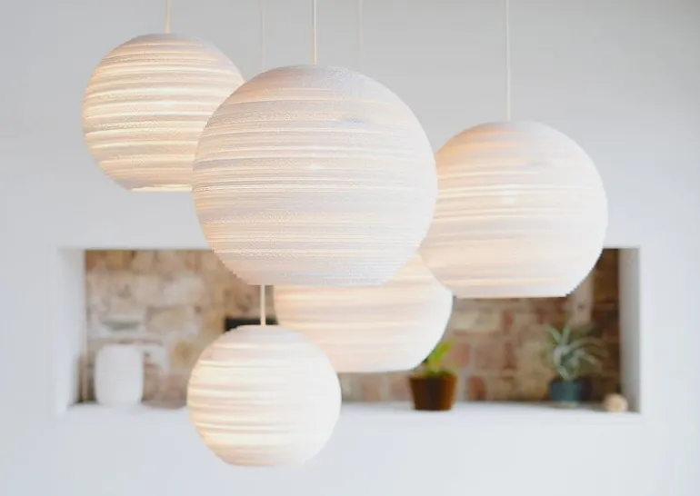 Moon är en del av Graypants’ Scraplights-kollektion som innehåller distinkta lampor gjorda av veckad kartong. Det specialtillverkade, helt vita materialet är laserskuret och monterat för hand i önskad form, med hjälp av ett giftfritt lim, och avslutas med ett giftfritt flamskyddsmedel. Unika och hållbart tillverkade, Scraplights-pendellampor lägger till en naturlig, organisk touch till alla interiörer, både individuellt och i kluster.
