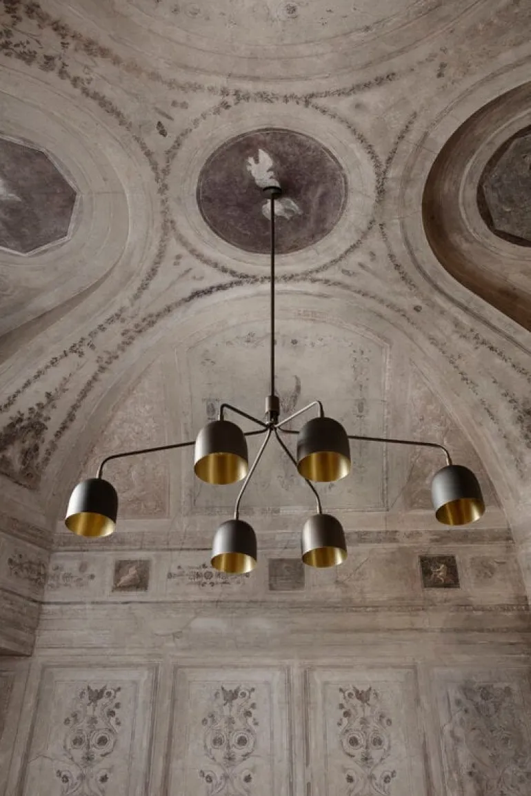 GUBI:s ljuskrona Howard är designad av designduon Space Copenhagen. Howard, som är inspirerad av New Yorks råa och industriella estetik, är en samtida men ändå lyxig blickfångare som skapar en välkomnande atmosfär i ditt hem. Den skulpturala lampan består av slanka armar och sex mässingsskärmar med en mörk yta i gunmetal. Innersidan av skärmarna glänser dock i blank mässing, vilket skapar ett behagligt varmt ljus över matbordet eller soffgruppen.