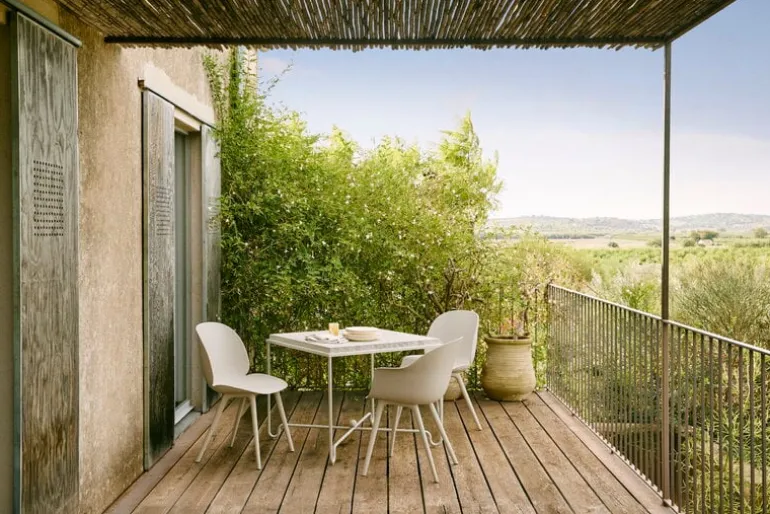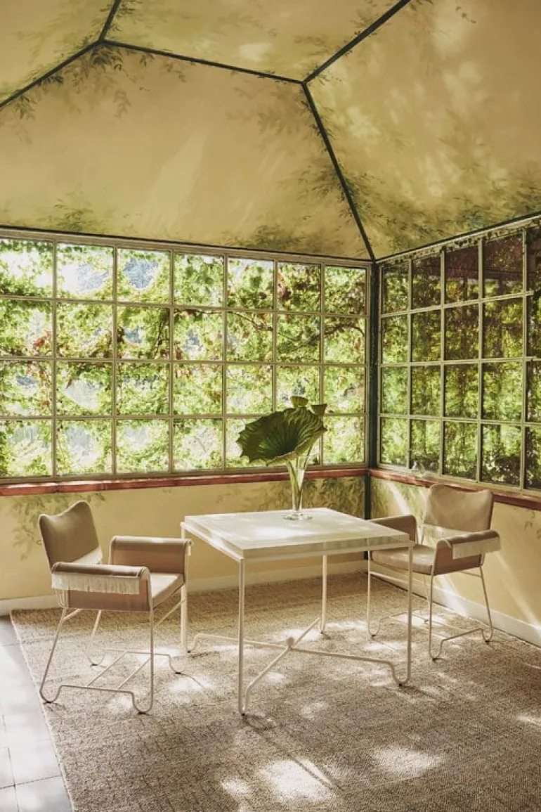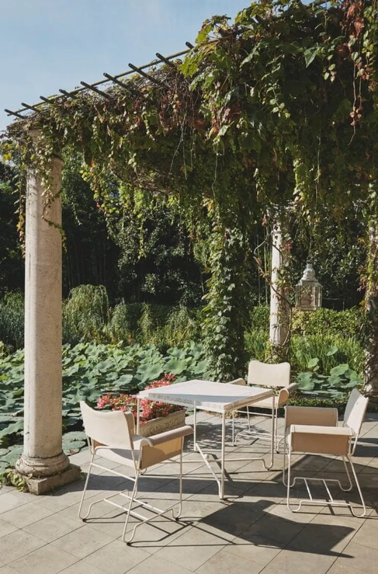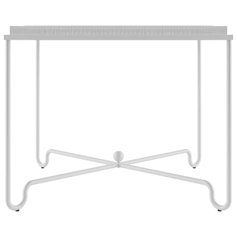 GUBI:s utomhusbord Tropique utstrålar en känsla av glamour och lyx, särskilt från svunna tider. Bordet, som designades av Mathieu Matégot 1951, består av ett smalt, lekfullt böjt metallstativ och en perforerad bordsskiva som låter solljuset passera igenom och skapa vackra mönster i omgivningen.