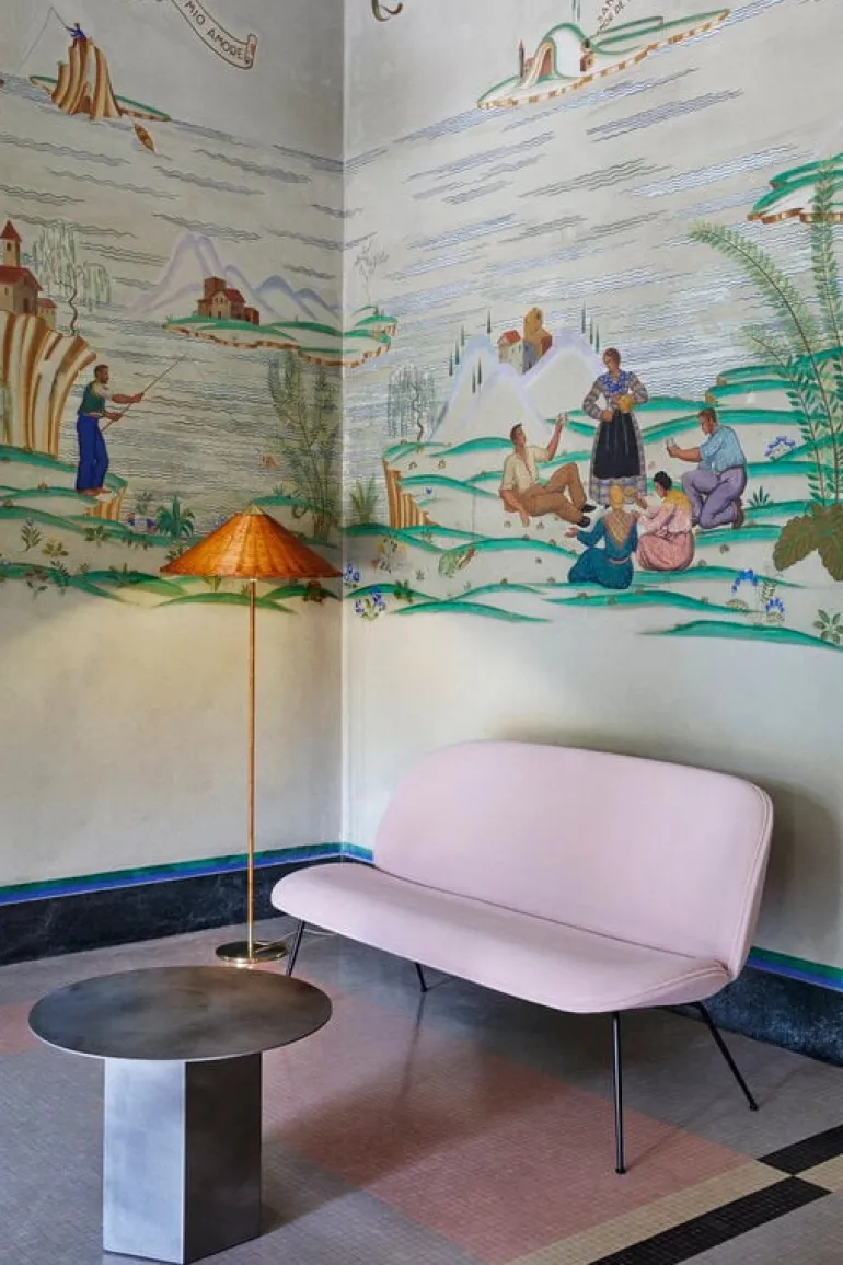 Den finska belysningsdesignern Paavo Tynell skapade golvlampan 9602 för hotellet Aulanko i Tavastehus, Finland år 1935. Lampan kännetecknas av en bred skärm som liknar en traditionell kinesisk hatt och en smal, rottingklädd fot som kontrasteras av glänsande mässing i basen och på toppen av lampskärmen. 9602-lampan är ett utmärkt exempel på Tynells förmåga att förvandla belysning till konst och kombinera olika material sömlöst. Armaturen är en del av Paavo Tynell-kollektionen som släpptes 2018 av det danska designmärket Gubi.