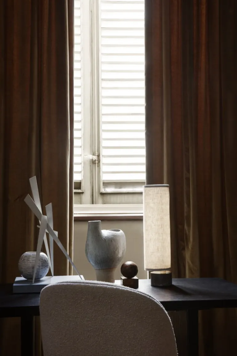 GUBI:s bordslampa Unbound skapar en sofistikerad men ändå mysig atmosfär i en mängd olika inredningsstilar. Designad av studion Space Copenhagen, är Unbound-belysningsserien inspirerad av estetiken hos japanska papperslyktor, vilket syns i den etervackra, linneskärmen. En tårformad, solid marmorbotten fungerar som ett tungt ankare för att stödja den lätta, smala skärmen.
