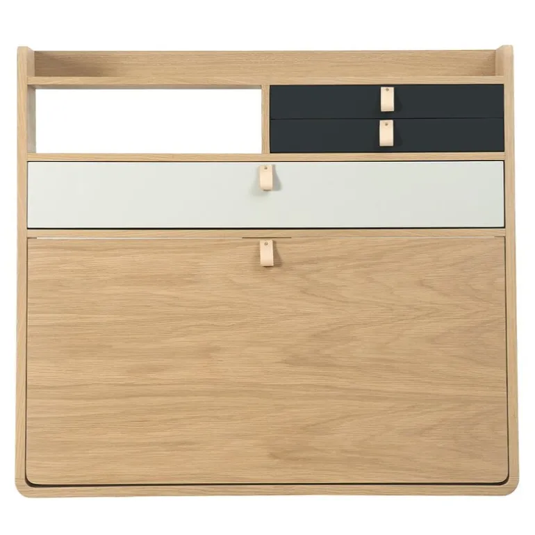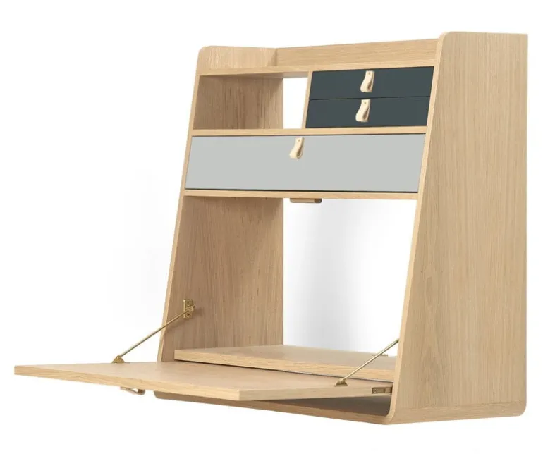 Hartôs väggskrivbord Gaston kommer att glädja dig med sin mångsidighet. Den stiliga förvaringsenheten kan användas i sin traditionella roll som en hylla eller, mer överraskande, som ett skrivbord. Det fällbara bordet är lätt att dra ut och stänga när det inte längre behövs. Gaston väggskrivbord är idealiskt för ett mindre hemmakontor men fungerar också bra som extra väggyta på företagets kontor. Hyllor och tre lådor säkerställer att det finns gott om förvaringsutrymme för viktiga papper, tidskrifter och andra små föremål. Gastons utseende fulländas av de eleganta läderhandtagen på lådorna, designade av Florence Watine.