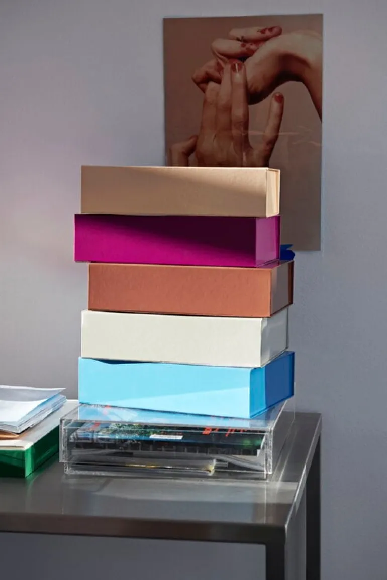 HAY:s Colour förvaringslådor gör städning roligt med sin ljusa färgpalett. Tillverkade av robust kartong, har Colour förvaringslådorna en praktisk magnetisk stängning. De roliga lådorna är perfekta för att förvara och organisera kontorsmaterial, smycken eller barnleksaker, bland annat. Välj och blanda olika färger och storlekar och skapa en regnbåge av Colour förvaringslådor, eller tona ner saker och ting med en monokrom kombination.
