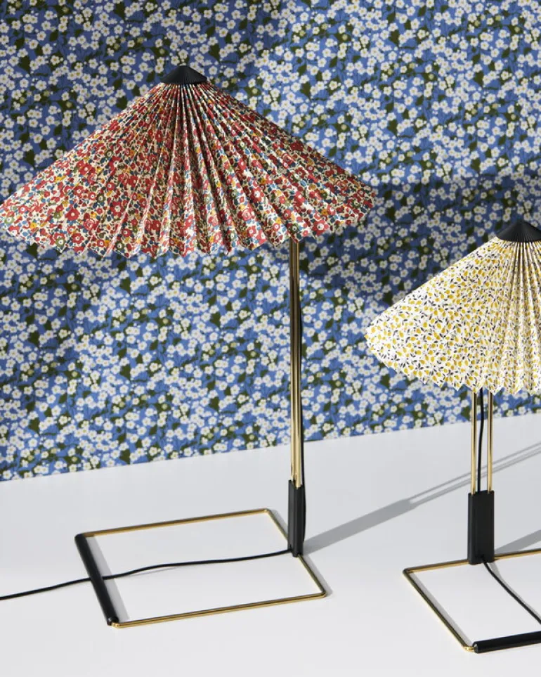 Om du inte har varit i London så är Liberty ett lyxvaruhus och historiskt landmärke som är känt för sina starka band till konst, design och kultur. Det de är mest kända för är sina effektfulla blomtyger, som på ett genialiskt sätt införlivats i Matin-lampskärmarnas veckade utförande. Lamporna i kollektionen har dessutom fått sina namn efter tygdesignerna. Genom att lampans fot är gjord av ståltråd med en yta av polerad mässing, så förenas poesi och visuell finess med fysisk styrka, medan Libertys lekfullt utformade tryck lägger till ytterligare en nivå i Sempés smarta design, där hon låter det klassiska kontrastera det moderna.