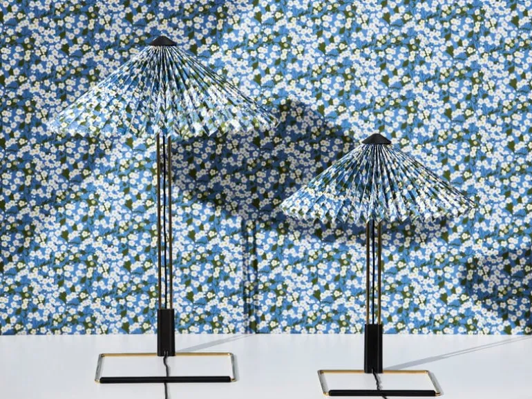 Om du inte har varit i London så är Liberty ett lyxvaruhus och historiskt landmärke som är känt för sina starka band till konst, design och kultur. Det de är mest kända för är sina effektfulla blomtyger, som på ett genialiskt sätt införlivats i Matin-lampskärmarnas veckade utförande. Lamporna i kollektionen har dessutom fått sina namn efter tygdesignerna. Genom att lampans fot är gjord av ståltråd med en yta av polerad mässing, så förenas poesi och visuell finess med fysisk styrka, medan Libertys lekfullt utformade tryck lägger till ytterligare en nivå i Sempés smarta design, där hon låter det klassiska kontrastera det moderna.