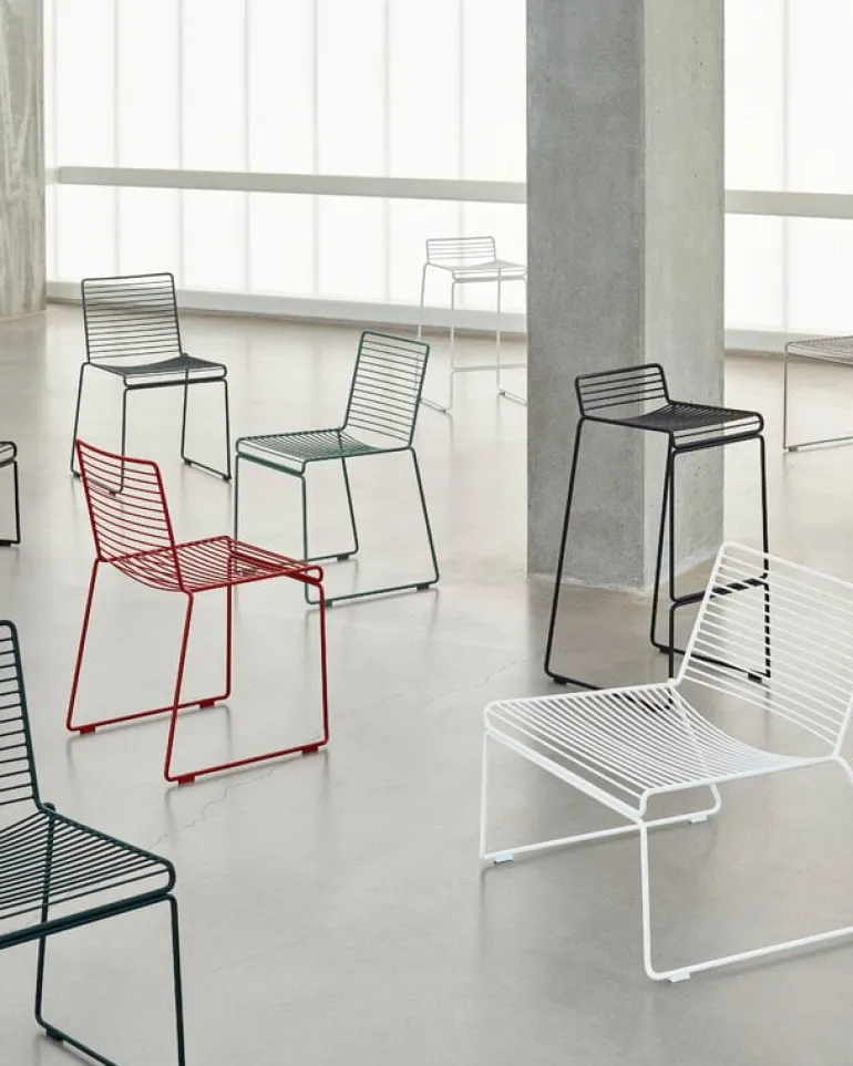Hee barstol från HAY är en modern designklassiker med en luftig metallkonstruktion som påminner om en tredimensionell linjeteckning. Tillverkad av elförzinkad ståltråd och behandlad med slitstark pulverlack, är Hee barstol perfekt för både inom- och utomhusbruk.