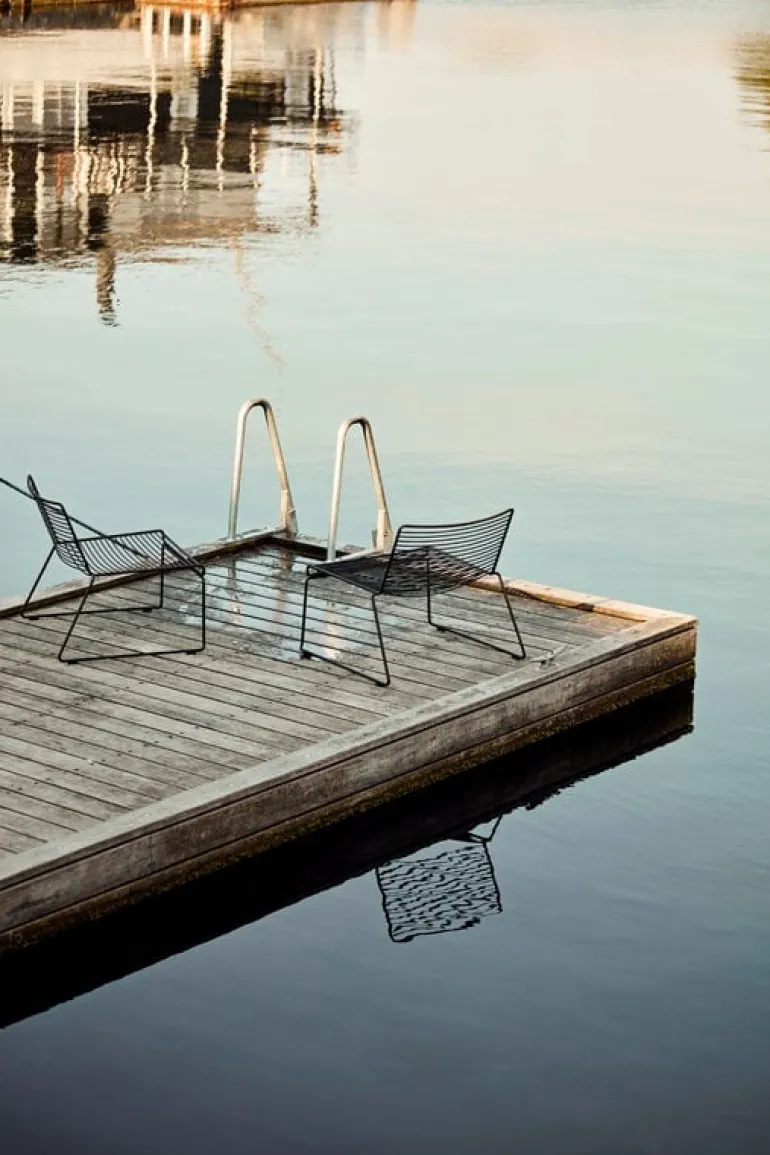 Hee fåtölj från HAY är en ikonisk möbel med en luftig metallram som liknar en skiss i rymden. Tillverkad av elförzinkad ståltråd och belagd med en slitstark pulverlack, passar Hee loungestol lika bra inomhus som utomhus.