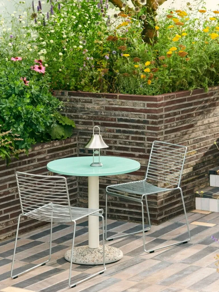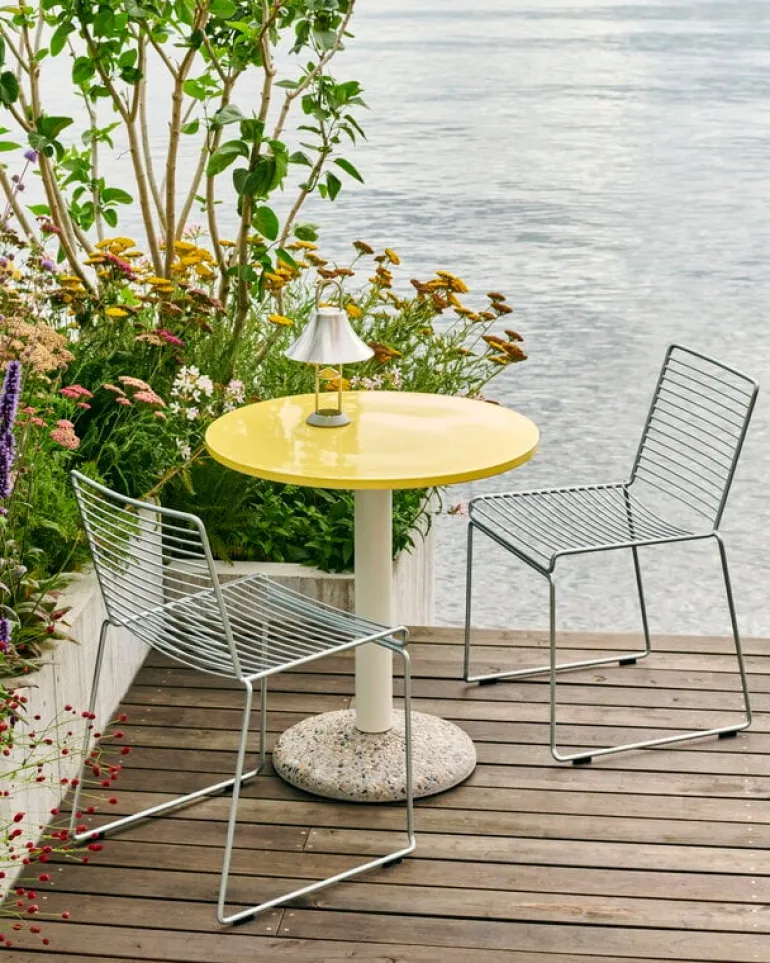 HAY:s stol Hee är en modern designklassiker som kännetecknas av sin luftiga metallstruktur som liknar en tredimensionell linjeteckning. Hee-stolen är tillverkad av galvaniserat stål och tål konstant fukt och temperaturväxlingar utan att rosta – denna underhållsfria utomhusstol passar även i tuffa förhållanden, från saltstänkta kustklimat till oförutsägbara nordiska klimat.