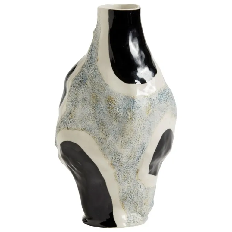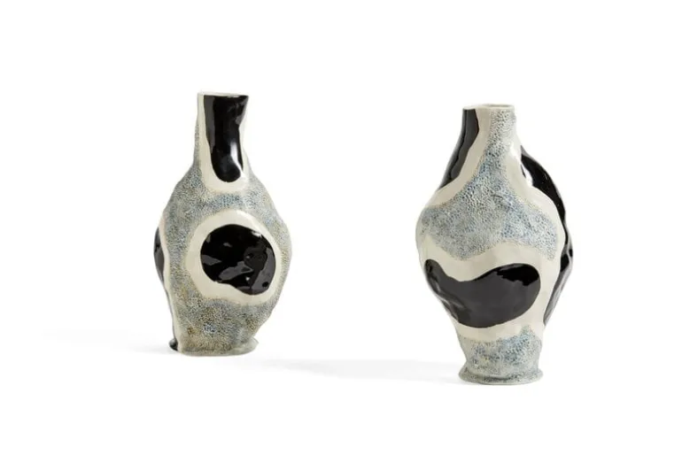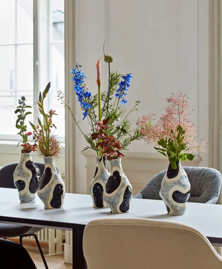 Vasen Glossy cow från HAY designades av konstnären Jessica Hans. Hans hämtar inspiration till sitt arbete från naturen, mer specifikt de organiska mönster som finns på växter och stenar. Det handmålade motivet framhäver vasens taktila yta och ger den ett unikt uttryck. Den moderna, eleganta designen skapar en fantastisk kombination tillsammans med ett livfullt blomsterarrangemang, men vasen Glossy cow är också en stark solitär.