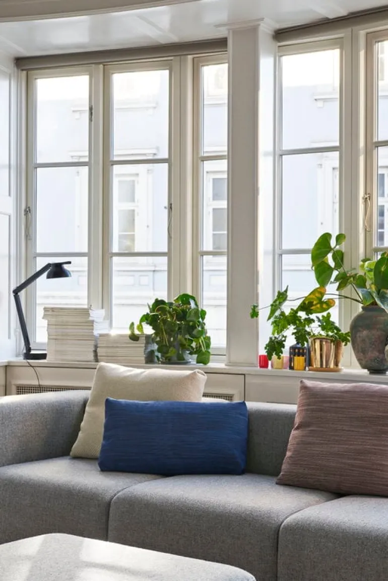 Hays Mags-kollektion består av olika kombinationer av soffmoduler och schäslonger. Modulstrukturen gör dem enkla att anpassa och skräddarsy till olika utrymmen. Den här Mags-soffan har klätts i ett grått Hallingdal ylletyg från Kvadrat.