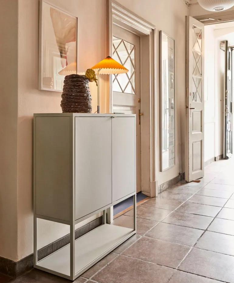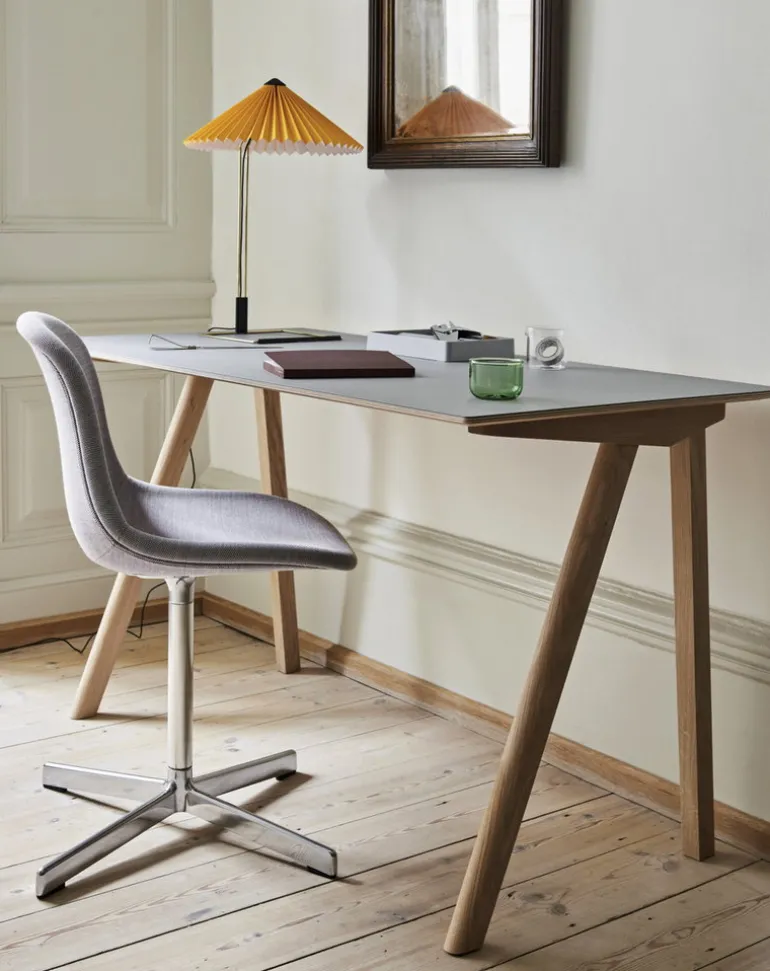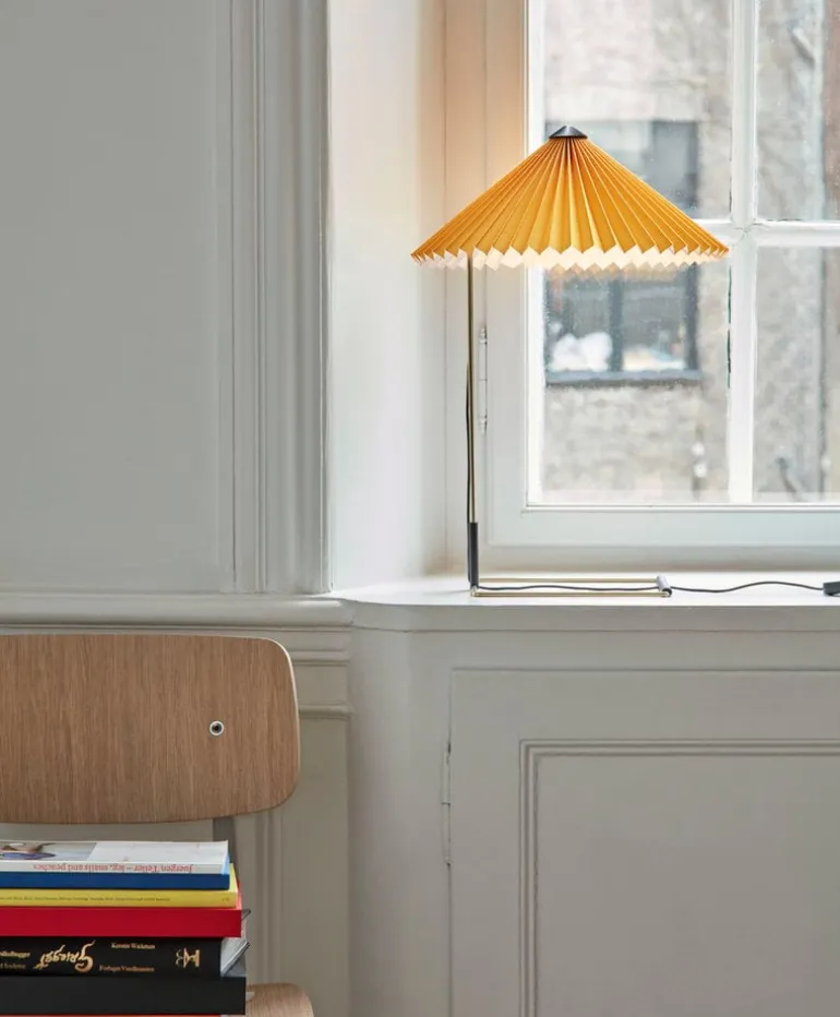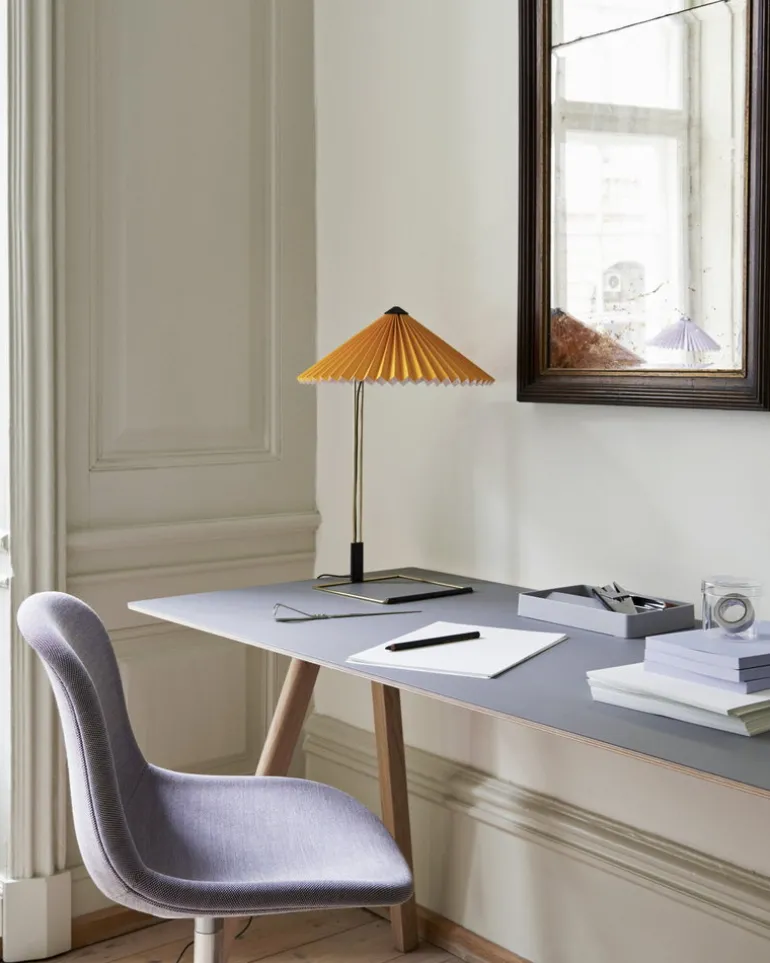 Matin är en elegant bordslampa från Hay, formgiven av Inga Sempé. Lampan har en vackert veckad skärm som finns i en rad kulörer, både klara och mer dämpade. Skärmen vilar på ett slankt och geometriskt metallstativ. Matin har en charmig klassisk look med en modern twist. Den sprider elegant sitt mjuka ljus på kontoret, i sovrummet eller i offentliga miljöer.