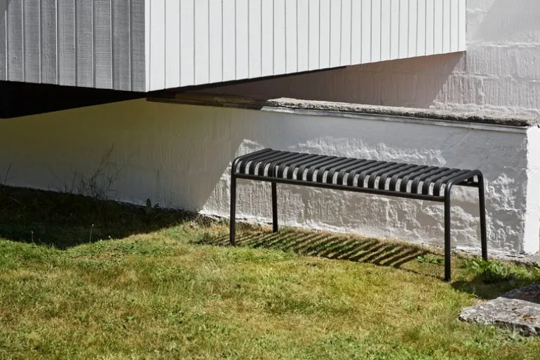 Den eleganta men ändå robusta Palissade-bänken är medlem i Hays mångsidiga kollektion av utemöbler. Palissade utemöbler har en kraftfull, grafisk design som består av enkla stålrör och lameller. Ronan och Erwan Bouroullec arbetade med kollektionen i två år och skapade en kollektion med enkla, välavvägda möbler som lämpar sig väl för terrasser, balkonger, trädgårdar, kaféer och offentliga utrymmen. Palissade stolar, bord och bänkar är robusta men eleganta, och perfekta för utomhusbruk, eftersom vind och vatten kommer att passera genom den galvaniserade stålramen. Palissade-möblerna är gjorda för att åldras vackert, och paletten med dämpade färger förstärker intrycket av tidlöshet och mångsidighet.