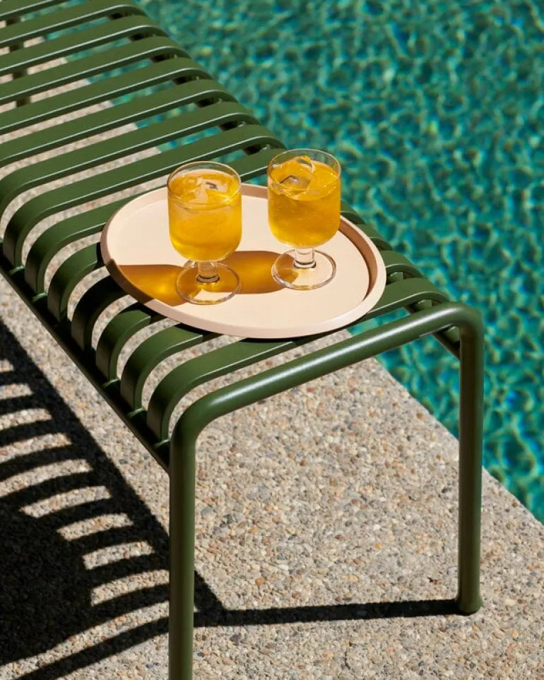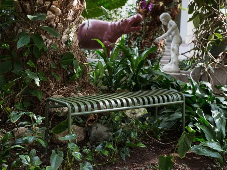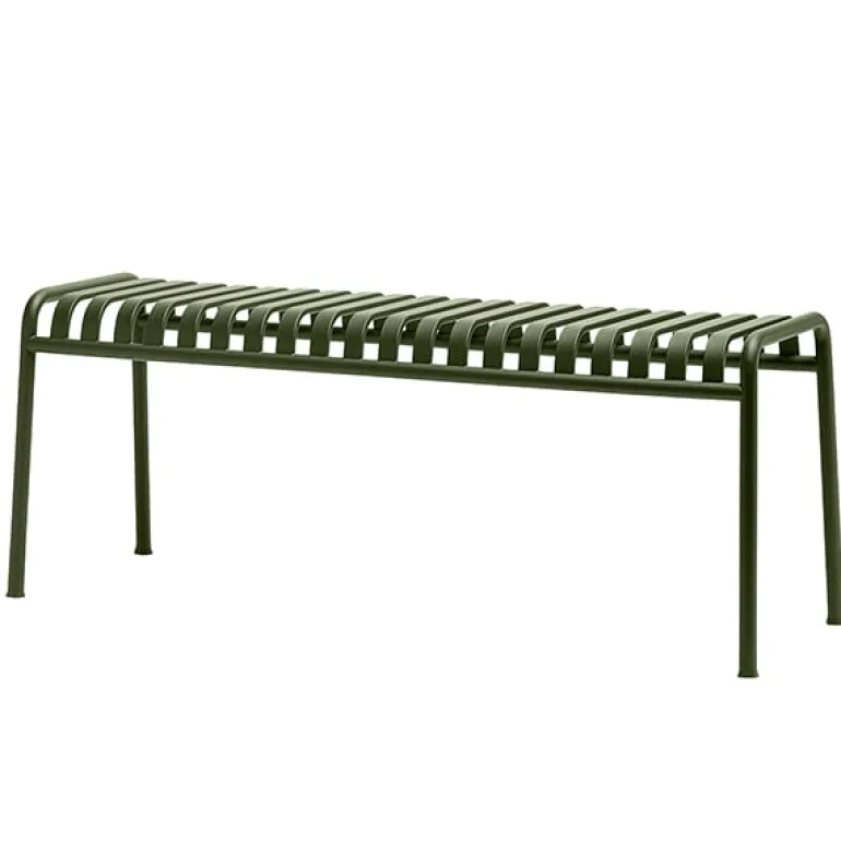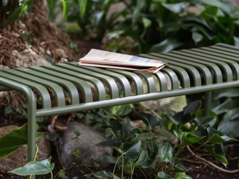 Den eleganta men ändå robusta Palissade-bänken är medlem i Hays mångsidiga kollektion av utemöbler. Palissade utemöbler har en kraftfull, grafisk design som består av enkla stålrör och lameller. Ronan och Erwan Bouroullec arbetade med kollektionen i två år och skapade en kollektion med enkla, välavvägda möbler som lämpar sig väl för terrasser, balkonger, trädgårdar, kaféer och offentliga utrymmen. Palissade stolar, bord och bänkar är robusta men eleganta, och perfekta för utomhusbruk, eftersom vind och vatten kommer att passera genom den galvaniserade stålramen. Palissade-möblerna är gjorda för att åldras vackert, och paletten med dämpade färger förstärker intrycket av tidlöshet och mångsidighet.