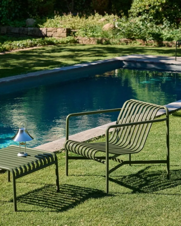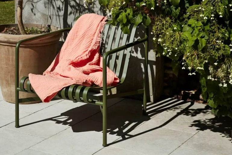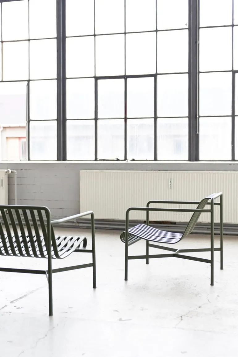 Den eleganta men ändå robusta Palissade-fåtöljen är medlem i Hays mångsidiga kollektion av utemöbler. Palissade utemöbler har en kraftfull, grafisk design som består av enkla stålrör och lameller. Ronan och Erwan Bouroullec arbetade med kollektionen i två år och skapade en kollektion med enkla, välavvägda möbler som lämpar sig väl för terrasser, balkonger, trädgårdar, kaféer och offentliga utrymmen. Palissade stolar, bord och bänkar är robusta men eleganta, och perfekta för utomhusbruk, eftersom vind och vatten kommer att passera genom den galvaniserade stålramen. Palissade-möblerna är gjorda för att åldras vackert, och paletten med dämpade färger förstärker intrycket av tidlöshet och mångsidighet.