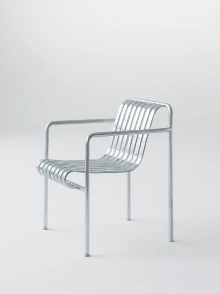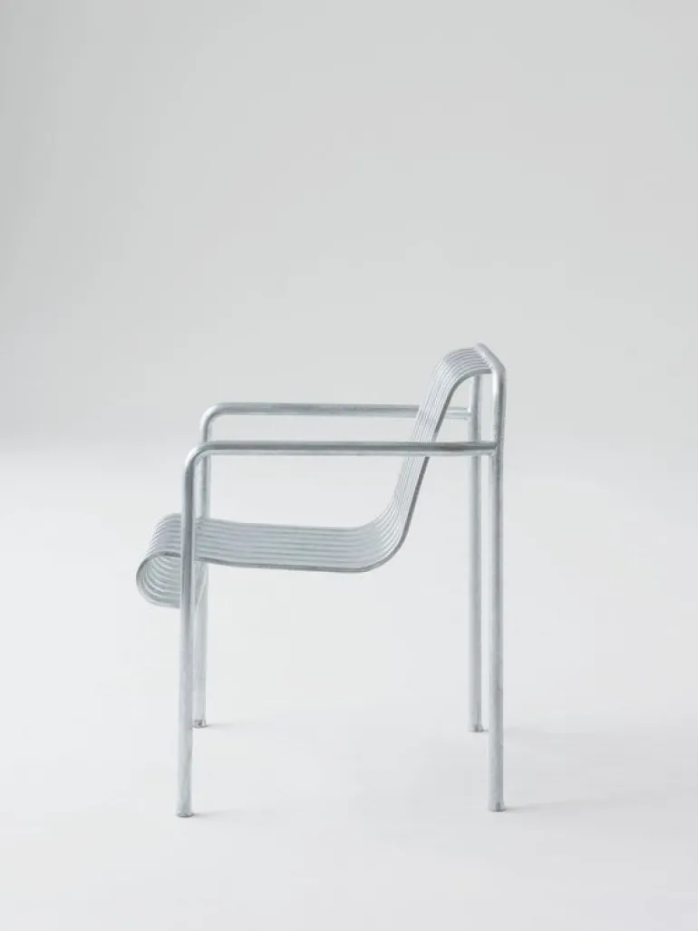 Den eleganta men ändå robusta Palissade-fåtöljen är medlem i Hays mångsidiga kollektion av utemöbler. Palissade utemöbler har en kraftfull, grafisk design som består av enkla stålrör och lameller. Ronan och Erwan Bouroullec arbetade med kollektionen i två år och skapade en kollektion med enkla, välavvägda möbler som lämpar sig väl för terrasser, balkonger, trädgårdar, kaféer och offentliga utrymmen. Palissade stolar, bord och bänkar är robusta men eleganta, och perfekta för utomhusbruk, eftersom vind och vatten kommer att passera genom den galvaniserade stålramen. Palissade-möblerna är gjorda för att åldras vackert, och paletten med dämpade färger förstärker intrycket av tidlöshet och mångsidighet.
