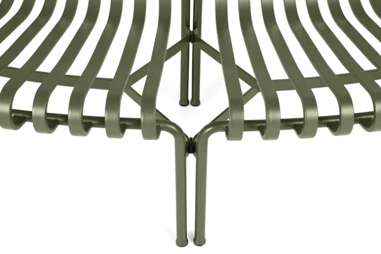 Matbänken Palissade Park är en del av HAY:s kollektion Palissade Park, som består av modulära bänkar designade speciellt för större utomhusområden och kontraktsanvändning. Genom att koppla samman två eller fler bänkar kan du skapa anpassade sittarrangemang i bågformade, vågformade och runda konfigurationer. De grundläggande modulerna för bänkarna är böjda antingen inåt (in) eller utåt (ut).