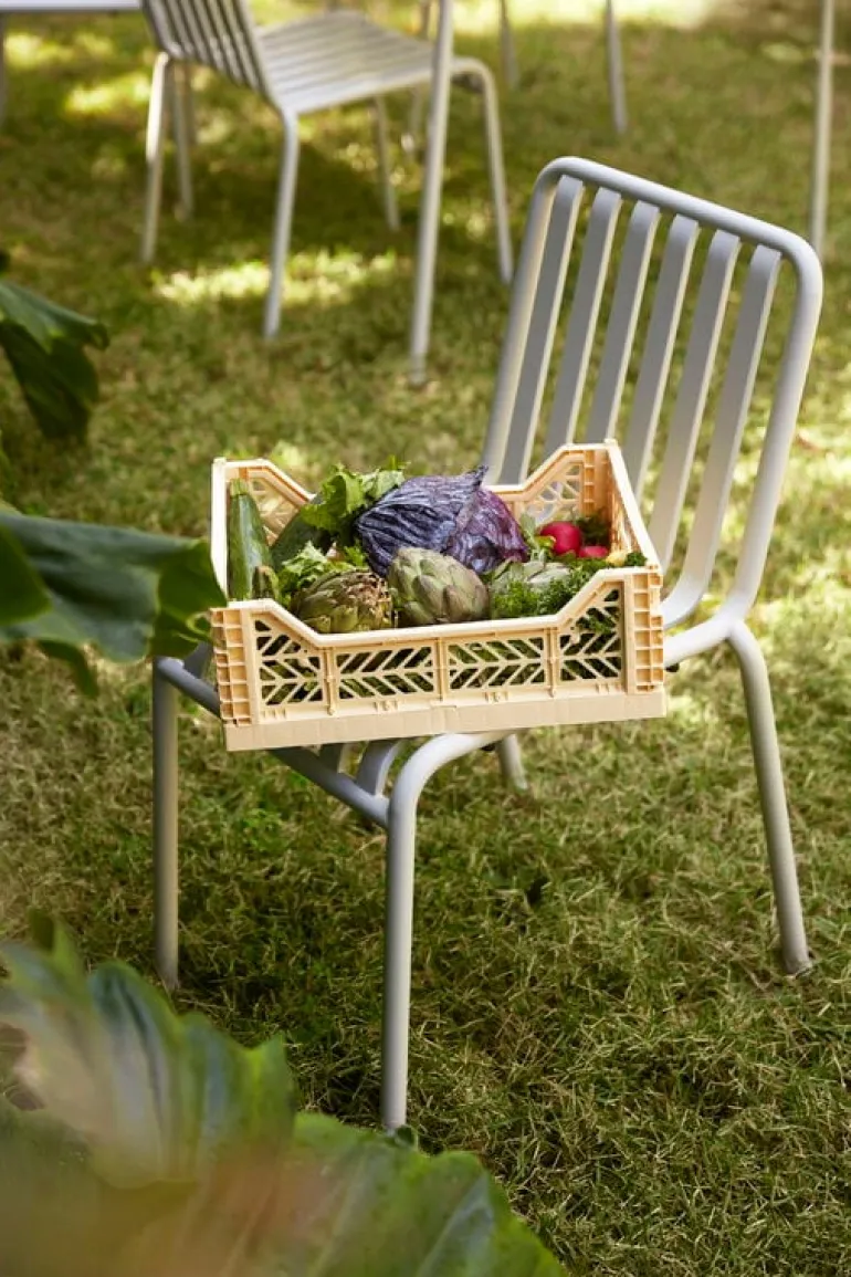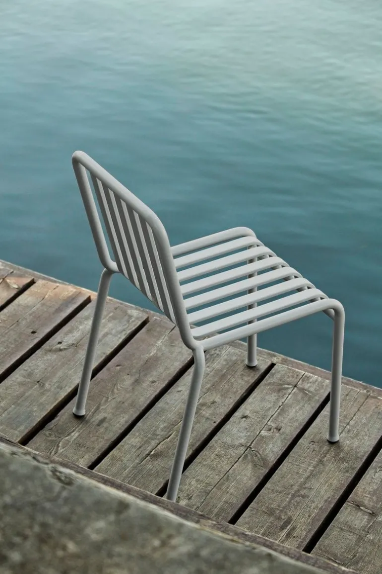 Den eleganta men ändå robusta Palissade-stolen är medlem i Hays mångsidiga kollektion av utemöbler. Palissade utemöbler har en kraftfull, grafisk design som består av enkla stålrör och lameller. Ronan och Erwan Bouroullec arbetade med kollektionen i två år och skapade en kollektion med enkla, välavvägda möbler som lämpar sig väl för terrasser, balkonger, trädgårdar, kaféer och offentliga utrymmen. Palissade stolar, bord och bänkar är robusta men eleganta, och perfekta för utomhusbruk, eftersom vind och vatten kommer att passera genom den galvaniserade stålramen. Palissade-möblerna är gjorda för att åldras vackert, och paletten med dämpade färger förstärker intrycket av tidlöshet och mångsidighet.