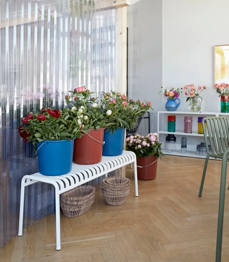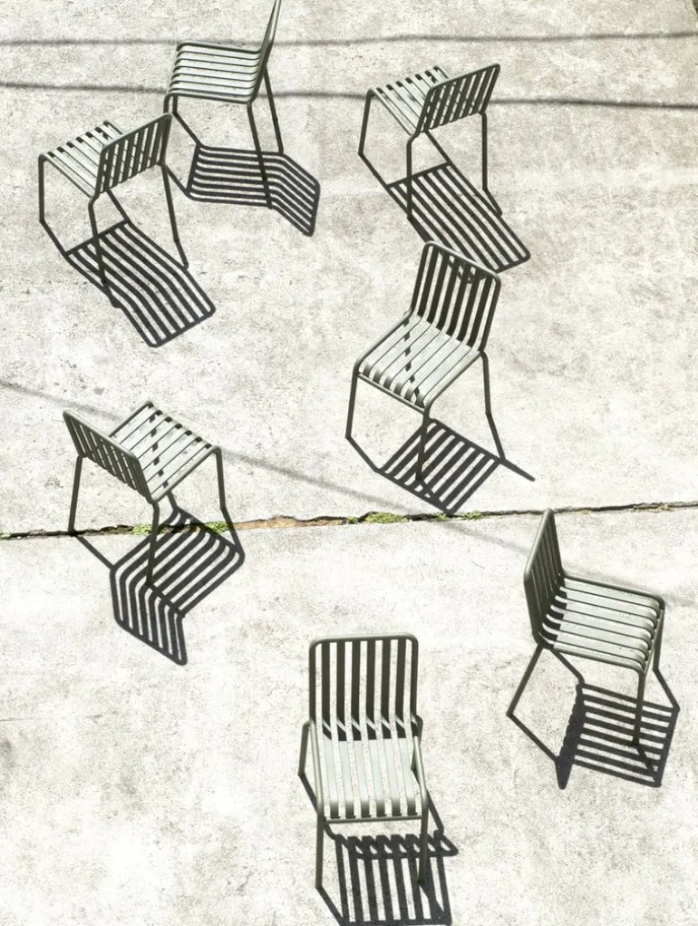 Den eleganta men ändå robusta Palissade-stolen är medlem i Hays mångsidiga kollektion av utemöbler. Palissade utemöbler har en kraftfull, grafisk design som består av enkla stålrör och lameller. Ronan och Erwan Bouroullec arbetade med kollektionen i två år och skapade en kollektion med enkla, välavvägda möbler som lämpar sig väl för terrasser, balkonger, trädgårdar, kaféer och offentliga utrymmen. Palissade stolar, bord och bänkar är robusta men eleganta, och perfekta för utomhusbruk, eftersom vind och vatten kommer att passera genom den galvaniserade stålramen. Palissade-möblerna är gjorda för att åldras vackert, och paletten med dämpade färger förstärker intrycket av tidlöshet och mångsidighet.