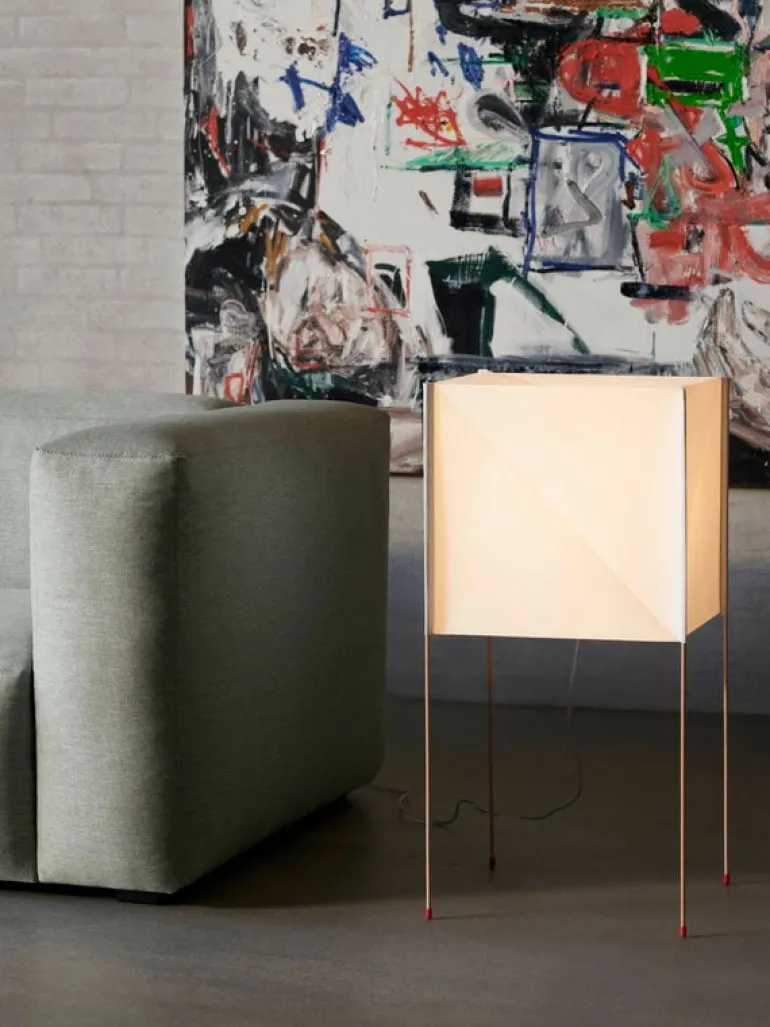 HAY:s Paper Cube golvlampa skapar en charmig och avslappnad atmosfär i olika rum i hemmet. Lampan, som är designad av Bertjan Pot, består av fyra tunna bokben som stödjer en genomskinlig lampskärm. Som namnet antyder är Paper Cube både kubformad och tillverkad av papper – inte det typiska tunna skrivpapperet, utan ett hållbart och starkt japanskt pappersmaterial tillverkat av återvunna PET-flaskor. Ljuset lyser mjukt och vackert genom skärmens tunna yta.