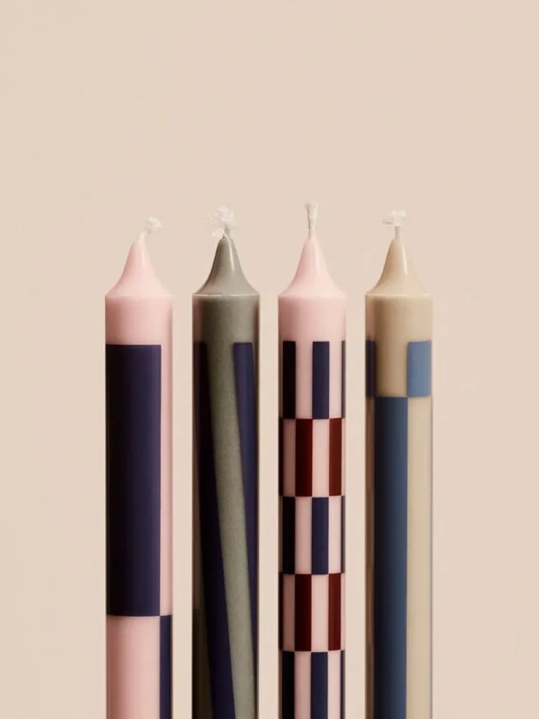 HAY:s Pattern-ljus är förtjusande med sina festliga geometriska mönster. De låter sig gärna användas som lekfullt utformade dekorelement, antingen individuellt eller i grupp om flera ljus. Ljusen är tillverkade av stearin och finns i många härliga färgblandningar – välj ut dina favoriter och njut av lågornas dans, eller ge bort de vackra ljusen i present till nära och kära! Förpackningen innehåller fyra ljus i olika färger och mönster, från ränder till kvadrater.