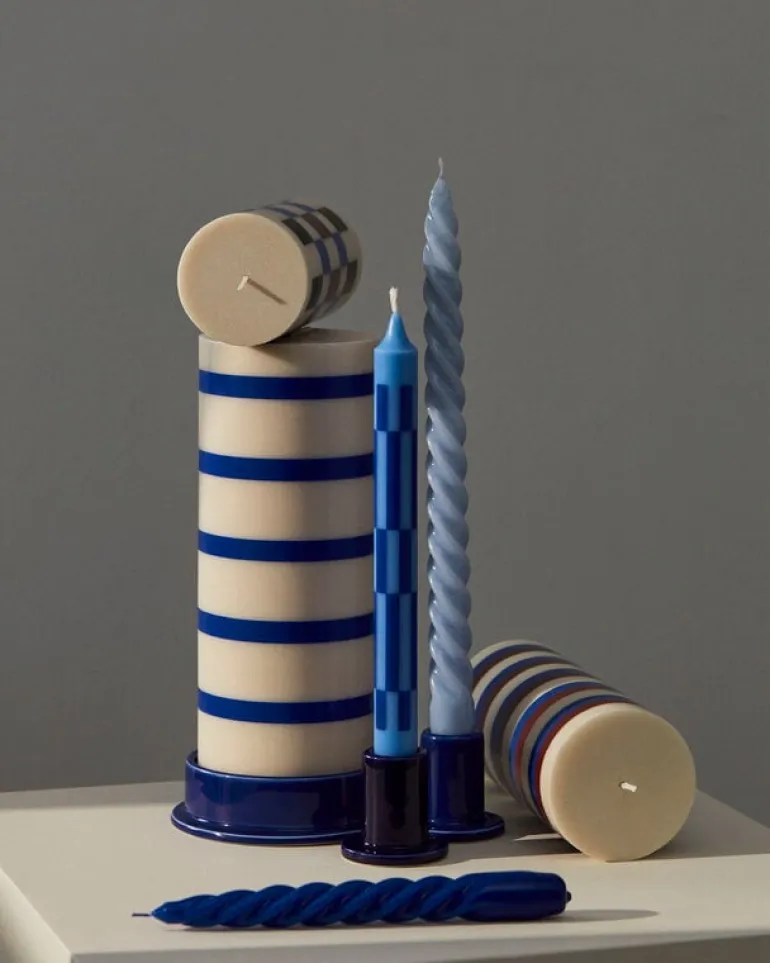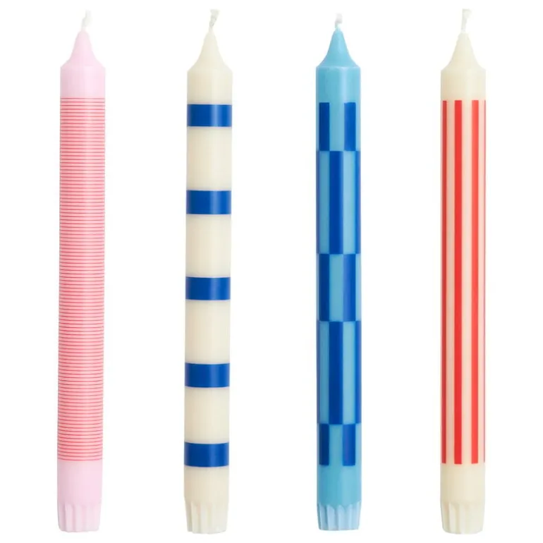HAY:s Pattern-ljus är förtjusande med sina festliga geometriska mönster. De låter sig gärna användas som lekfullt utformade dekorelement, antingen individuellt eller i grupp om flera ljus. Ljusen är tillverkade av stearin och finns i många härliga färgblandningar – välj ut dina favoriter och njut av lågornas dans, eller ge bort de vackra ljusen i present till nära och kära! Förpackningen innehåller fyra ljus i olika färger och mönster, från ränder till kvadrater.