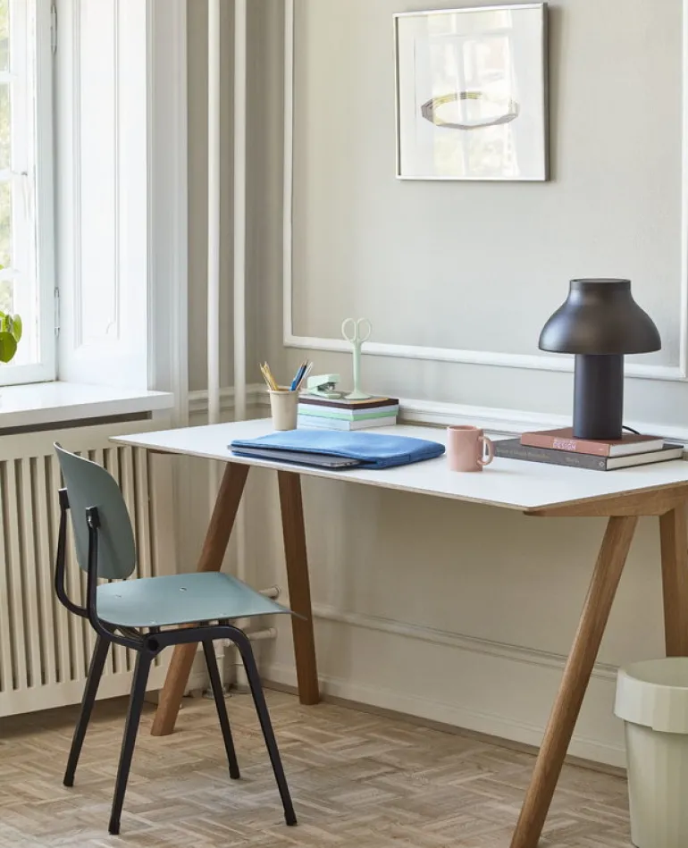 Bordslampan PC designades av Pierre Charpin för Hay och har en svampliknande form som är både tidig och futuristisk. Lampans ljuskälla är dold, så lampan har ett mjukt ljus som pekar neråt och minskar ljusskenet när du jobbar eller läser.