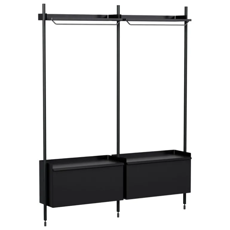 Denna tvådelade Pier System 1002-garderobskombination inkluderar en hylla med klädhängare och ett skåp med dörr i varje del. Stången, hyllan och skåpet är tillverkade av stål, medan den lätta men ändå tåliga ramen är gjord av aluminium, vilket garanterar både funktionalitet och tidlös stil.