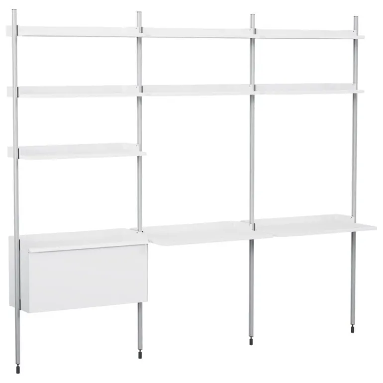 Kontorskombinationen Pier System 12 består av tre kolumner: en med tre hyllor och ett skåp med dörr, medan de två andra har två hyllor och en arbetsstation vardera. Hyllorna, arbetsstationen och skåpet är tillverkade av stål, medan den eleganta men robusta ramen är gjord av aluminium.