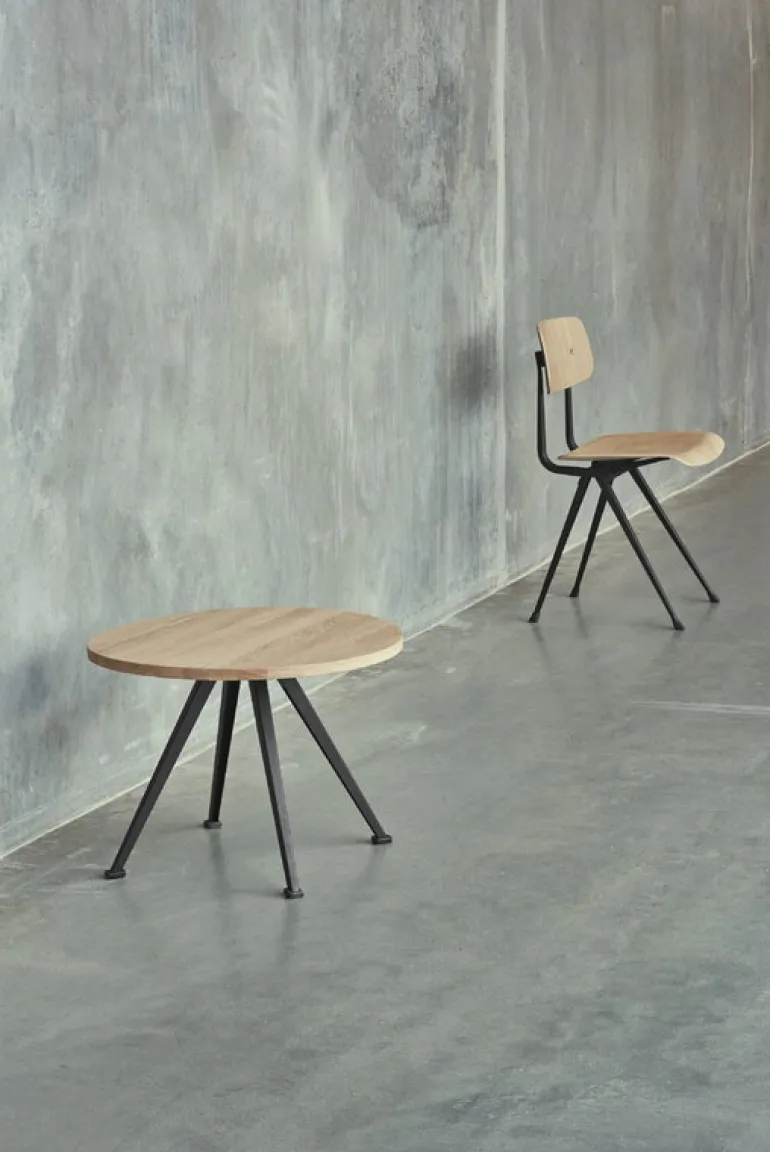 Med sina vinklade stålramar och stadiga bordsskivor i trä, andas Pyramid-kollektionen 1950-talets moderna ståldesign och har behållit sin tidlösa charm. Genom åren har möblerna blivit välkända inslag både i offentliga miljöer och i privata hem. De nyutgivna möblerna från HAY är lackerade med en miljövänlig, vattenbaserad lack.