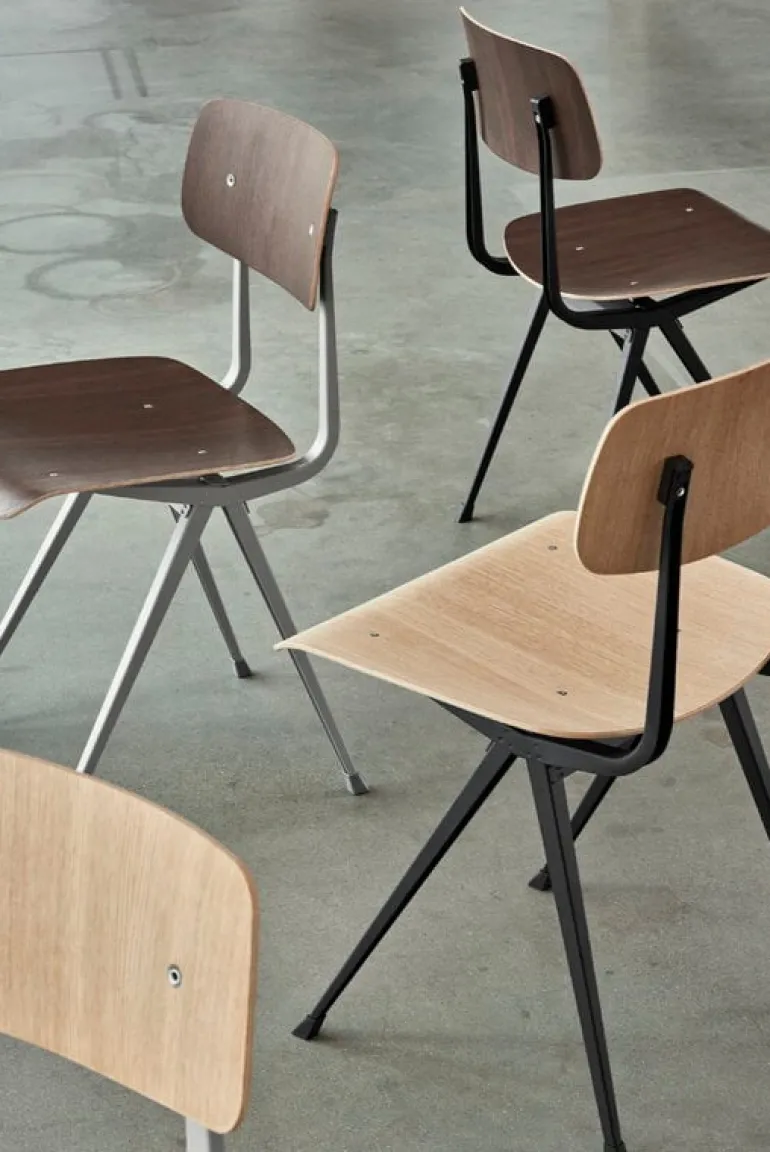 Stolen Result är designad av Friso Kramer och Wim Rietveld för Ahrend på 1950-talet och har återlanserats av Hay i samarbete med Ahrend. Result är en stilren kombination av en stålram och en sits samt ryggstöd i välvd plywood, och ansågs på 50-talet vara ett mästerverk tack vare det innovativa valet av plåt, och än i dag har stolen en fräsch framtoning. Tack vare den ljusa och funktionella designen var Result en populär stol i skandinaviska skolor, och har använts mycket både i allmänna och privata sammanhang. Framer och Rietveld skapade Result för att bilda par med bordet Pyramid, vilket är en perfekt matchning till stolen. Result finns tillgänglig i olika storlekar och kombinationer av basfärger och träfinish.