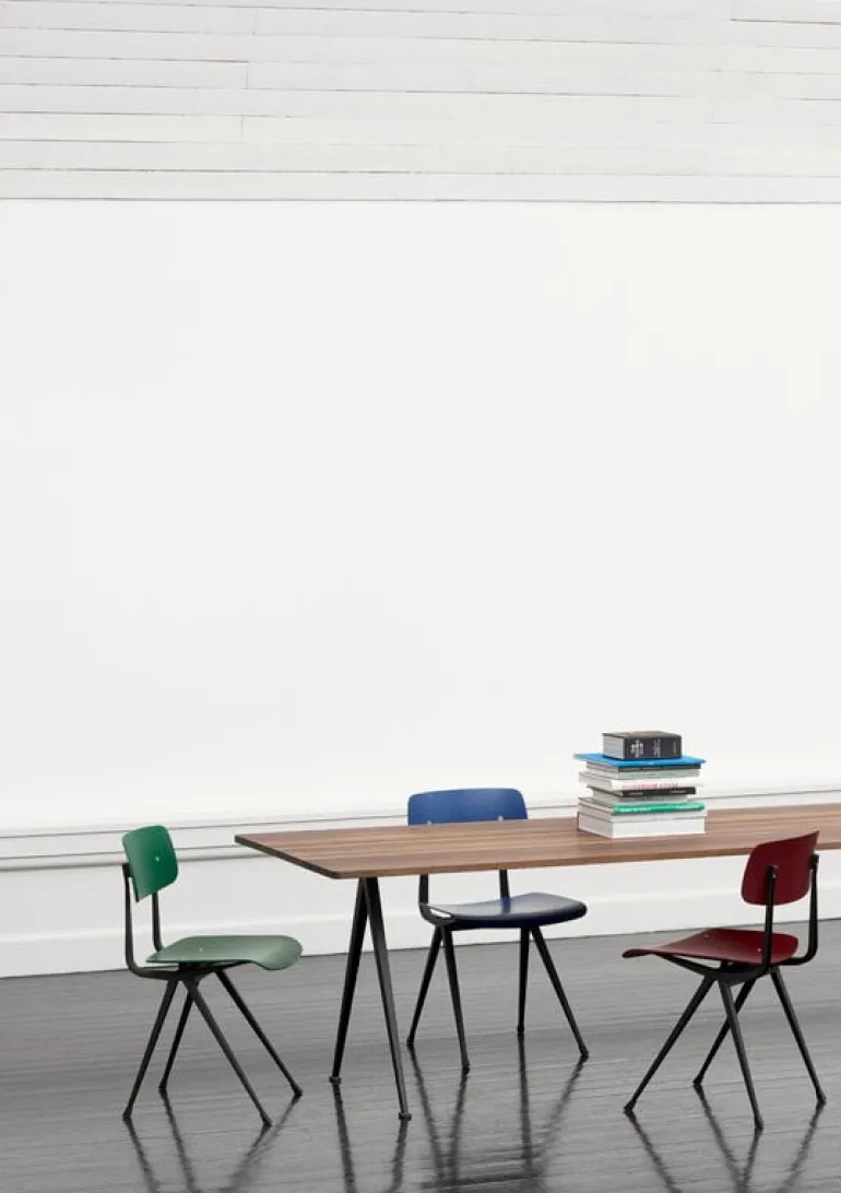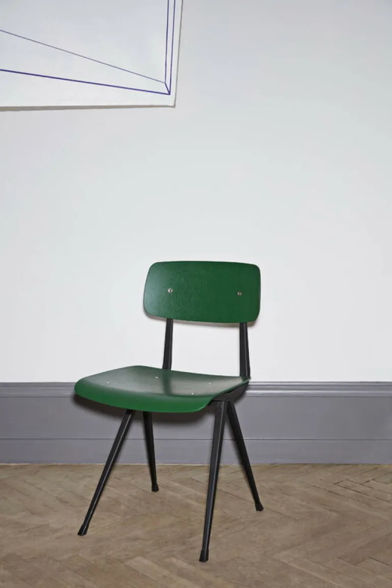 Stolen Result är designad av Friso Kramer och Wim Rietveld för Ahrend på 1950-talet och har återlanserats av Hay i samarbete med Ahrend. Result är en stilren kombination av en stålram och en sits samt ryggstöd i välvd plywood, och ansågs på 50-talet vara ett mästerverk tack vare det innovativa valet av plåt, och än i dag har stolen en fräsch framtoning. Tack vare den ljusa och funktionella designen var Result en populär stol i skandinaviska skolor, och har använts mycket både i allmänna och privata sammanhang. Framer och Rietveld skapade Result för att bilda par med bordet Pyramid, vilket är en perfekt matchning till stolen. Result finns tillgänglig i olika storlekar och kombinationer av basfärger och träfinish.