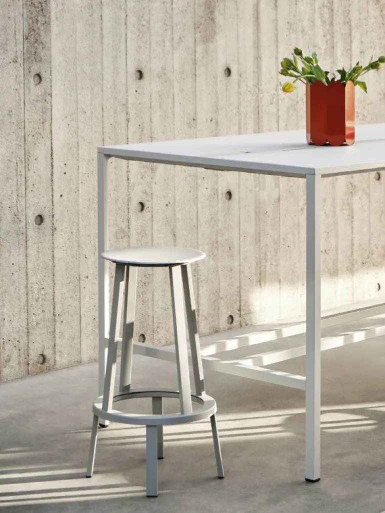 Pallen Revolver, formgiven av Leon Ransmeier för Hay, består av två delar: fyra stabila ben och en sits som går att snurra 360 grader. Den stadiga, allsidiga snurrpallen är tillverkad i pulverlackerat stål och är en fortsättning på Hays och barstolskollektionen Revolvers framgångssaga.