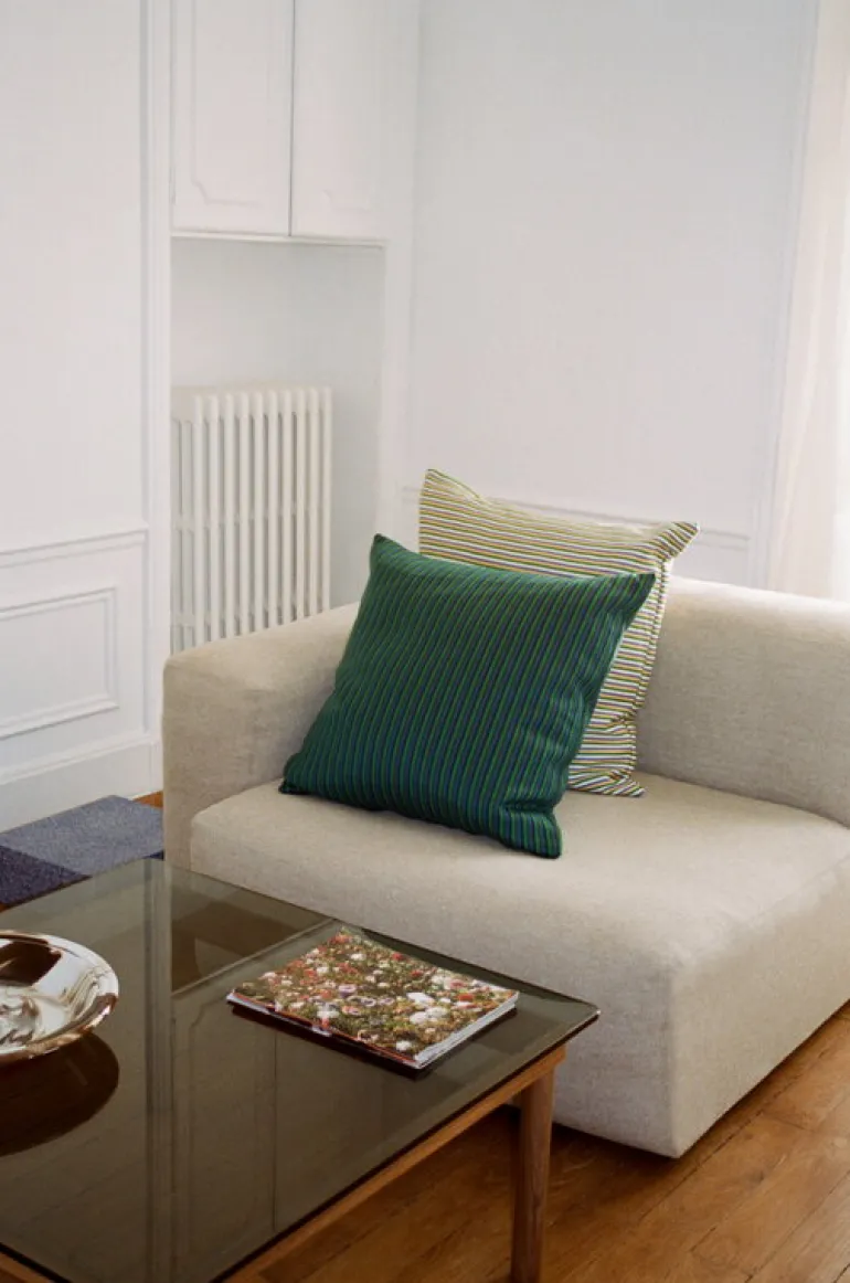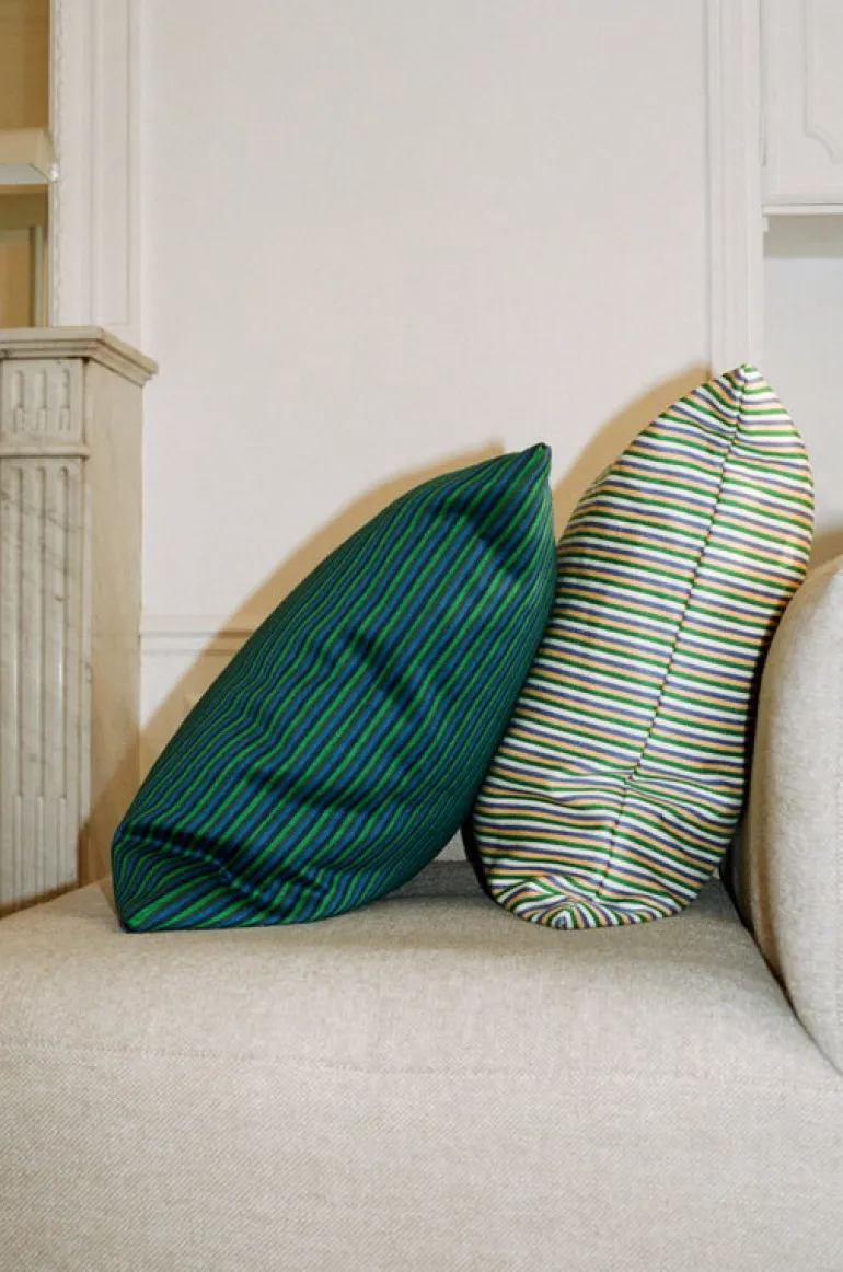HAY:s Ribbon-kudde förtrollar med sina glada färger. På avstånd ser den lekfulla kudden monokrom ut, men vid närmare granskning avslöjas en överraskande detalj: den gröna färgen på kudden består faktiskt av flera tunna ränder i olika färger. Den mjuka, fjäderfyllda dekorativa kudden passar i många inredningar och kommer att se härlig ut på en soffa eller fåtölj i vardagsrummet eller på en säng i sovrummet.