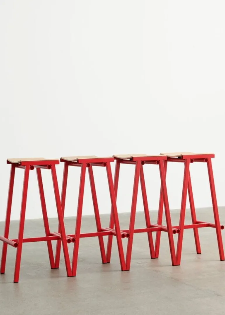 Taburete 8 från HAY är en enkel men uttrycksfull barstol som sprider glädje vid varje köksö, bardisk eller mötesbord. Den industriella ramen och fotstöden som sticker ut på Taburete 8 är tillverkade av målade stålrör. Det sitter en sits i ekfaner som skapar en mysig kontrast med sin graciösa, bågformade design, som uppnåtts genom att den enkelt fästs i stålramen under tryck.