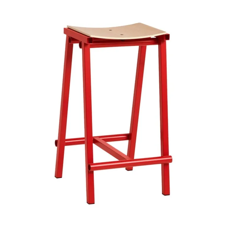 Taburete 8 från HAY är en enkel men uttrycksfull barstol som sprider glädje vid varje köksö, bardisk eller mötesbord. Den industriella ramen och fotstöden som sticker ut på Taburete 8 är tillverkade av målade stålrör. Det sitter en sits i ekfaner som skapar en mysig kontrast med sin graciösa, bågformade design, som uppnåtts genom att den enkelt fästs i stålramen under tryck.