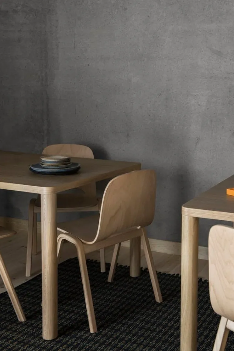 Log, som är designat av Julien Renault för Hem, är härligt okomplicerat i sin design och därför lämpligt för en mängd olika utrymmen och ändamål. Log är ett lätt bord, både visuellt och i vikt: dess vackra fanerade bordsskiva döljer en bikakestruktur som gör bordet lätt trots de robusta benen i massivt trä. Bordet passar både som matbord och som skrivbord. Den minimalistiska designen mjukas upp av ramens rundade kanter.