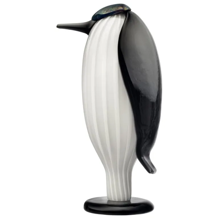 Oiva Toikkas Butler är en majestätisk fågel som visar upp sin eleganta, vita frack, sina raffinerade kamfjädrar och sitt långa näbb. Fågelns randiga dräkt är tillverkad med en speciell filigranteknik som än en gång visar upp Iittalas glasblåsares mästerliga hantverk.