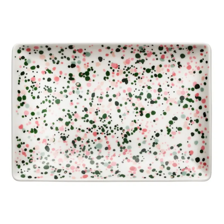Iittalas rektangulära tallrik från Oiva Toikka-kollektionen är prydd med det mångfärgade Helle-trycket, som ursprungligen designades för Arabia på 1980-talet. Tallriken i A5-storlek kan användas som frukosttallrik eller serveringsfat.