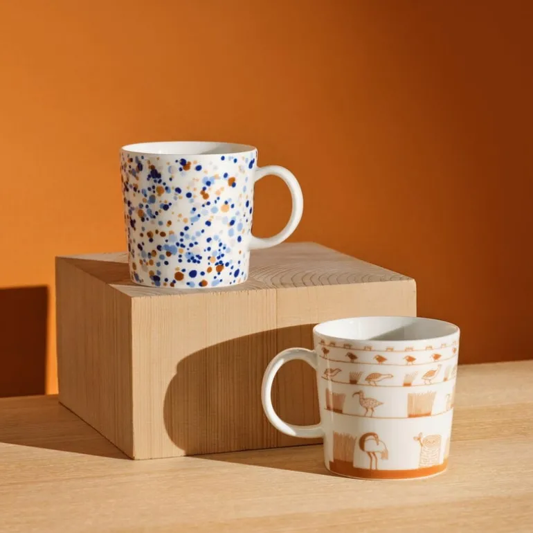 Iittalas 4 dl-mugg från Oiva Toikka-kollektionen är prydd med det mångfärgade Helle-trycket, som ursprungligen designades till Arabia på 1980-talet. Själva formen på muggen är bekant från den ikoniska Teema-serien, vilket gör att muggen lätt kan kombineras med andra Iittala-designer.