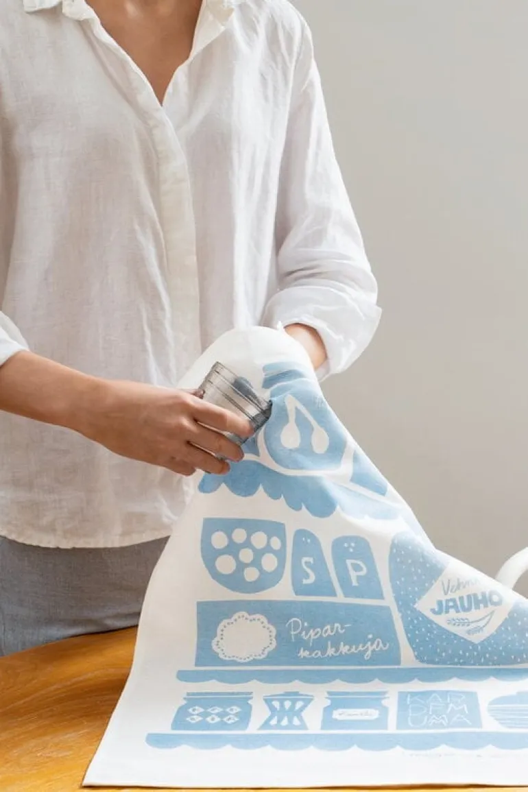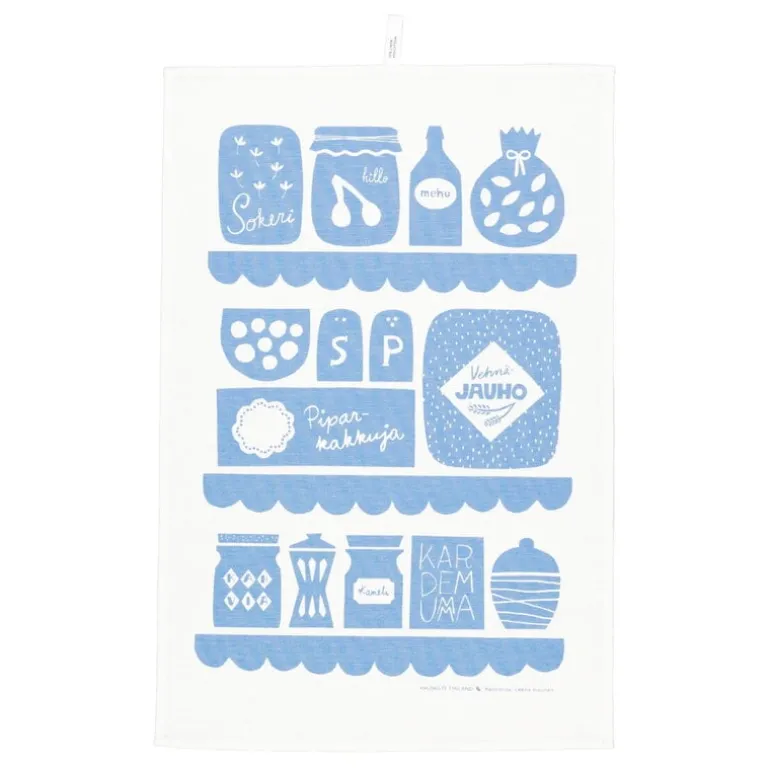 Kaunistes kökshandduk Keittiössä ger ett charmigt intryck med sina fascinerande illustrationer av kökets alla väsentligheter – därav namnet ”Keittiössä”, som betyder ”i köket” på finska. Handduken är tillverkad av en blandning av linne och bomull, och mönstret visar alla ingredienser som behövs till baket där hemma – allt från socker och vetemjöl till kanel och kardemumma, och där finns till och med ett paket pepparkakor! Den vackra kökshandduken, som formgivits av Leena Kisonen, har praktiskt nog försetts med en ögla upptill för att smidigt kunna hängas upp.