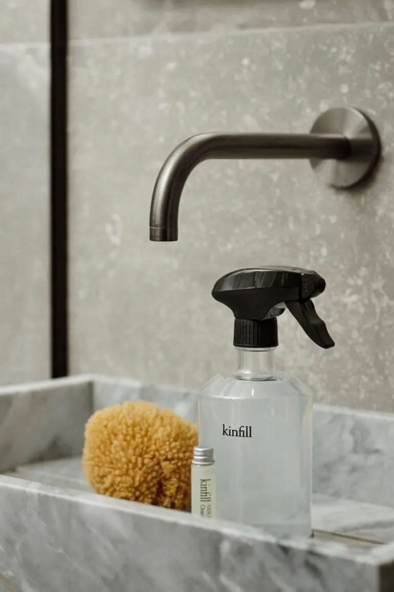 Kinfills köksrengöring gör alla köksytor fläckfria och gnistrande rena, oavsett om du skrubbar rostfritt stål eller en bänkskiva i marmor. Startpaketet innehåller en glassprayflaska och en separat tub med gurkdoftande rengöringskoncentrat.