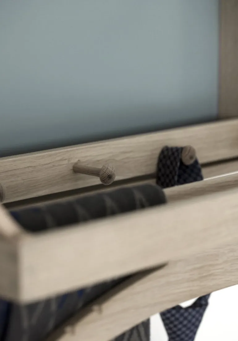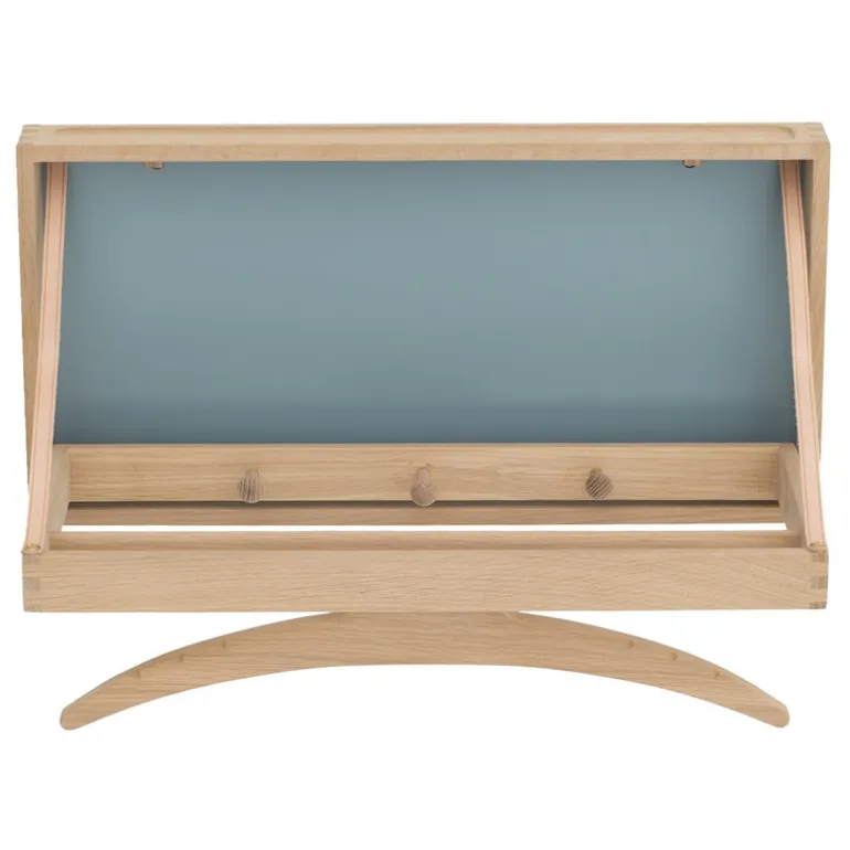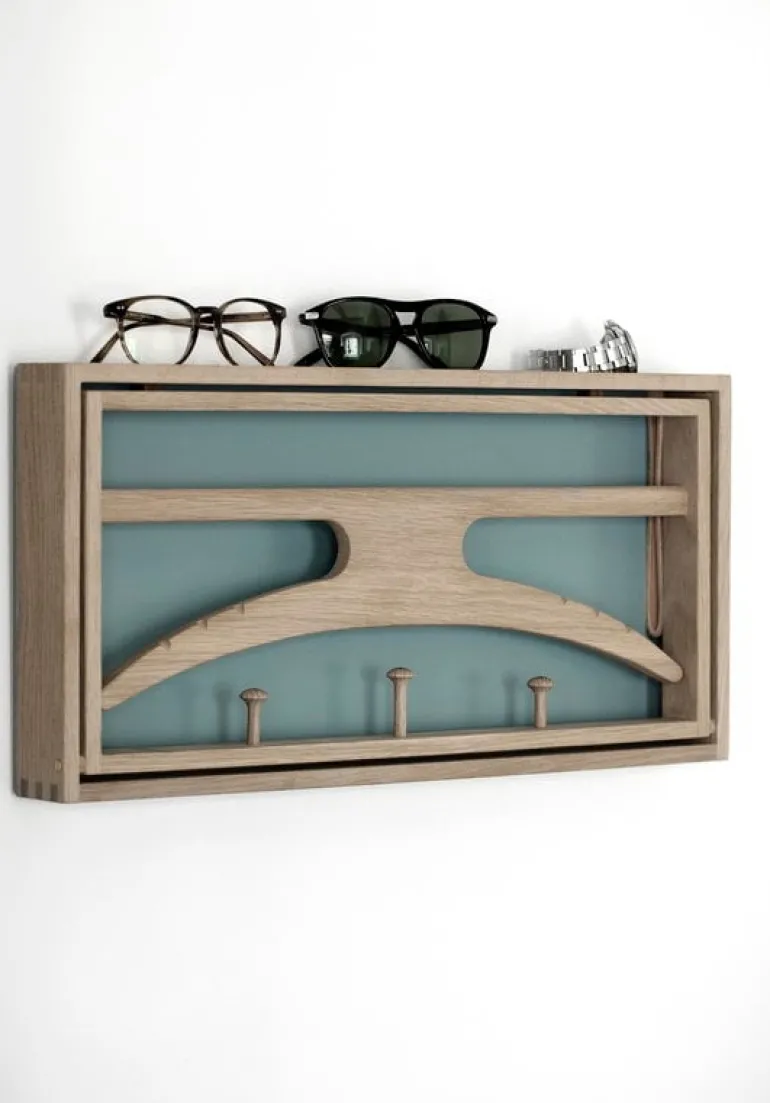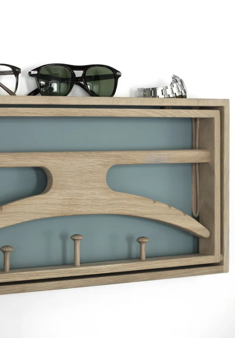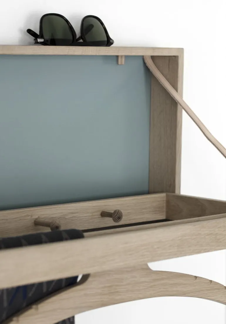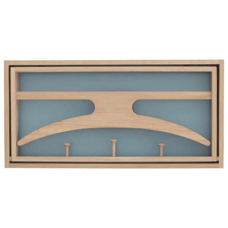 Klassik Studios The Hanger, formgiven av Adam Hoff och Paul Østergaard år 1964, är en smart, väggmonterad klädhängare och på samma gång ett litet, skulpterat konstverk. The Hanger har en fällbar ram med tre klädkrokar och en ställning med galge. I uppfällt läge skapar krokarna, ställningen och galgen ett kul, ekfärgat mönster mot den gråblå bakgrunden.