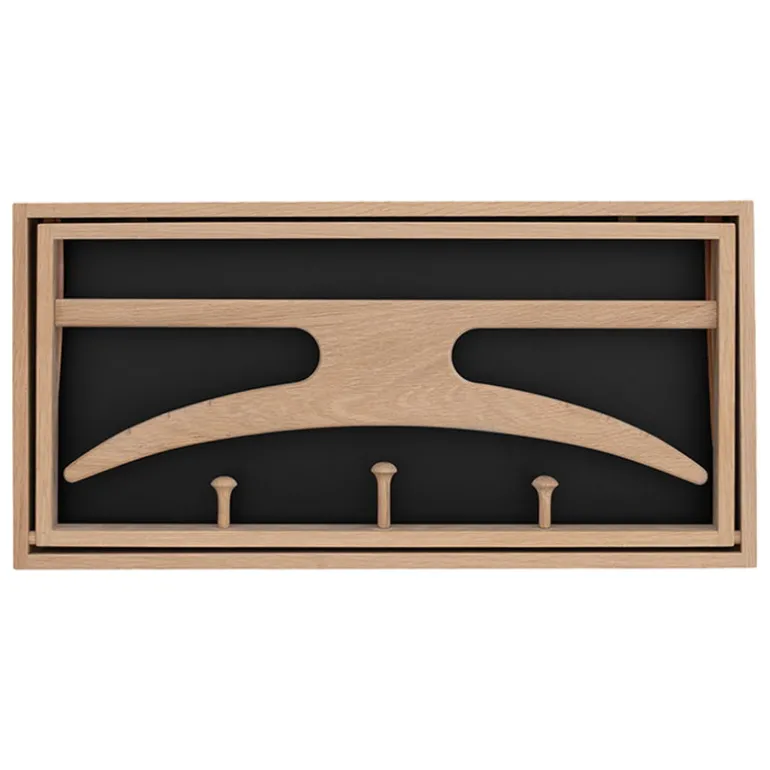 Klassik Studios The Hanger, designad av Adam Hoff och Poul Østergaard 1964, är en smart väggmonterad klädhängare och även ett litet, skulpturalt konstverk. The Hanger har en fällbar ram med tre klädkrokar och en hängare. När den är uppfälld skapar krokarna, hängaren och hängaren ett roligt ekfärgat mönster på den matta svarta bakgrunden.